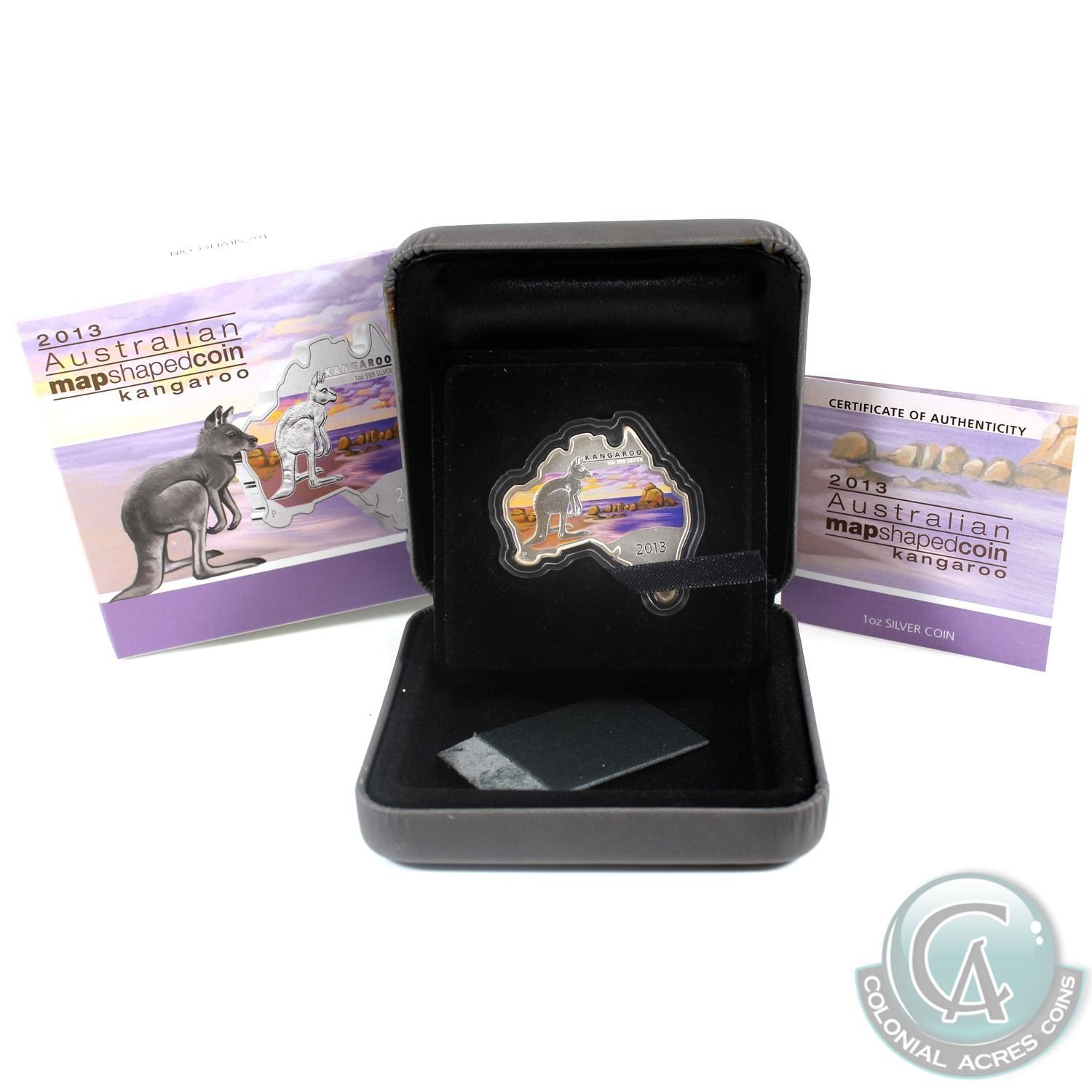 2013 Australia $1 Map Shaped - Kangaroo 1oz Fine Silver Coin (coin is lightly toned around edges). (Tax Exempt)