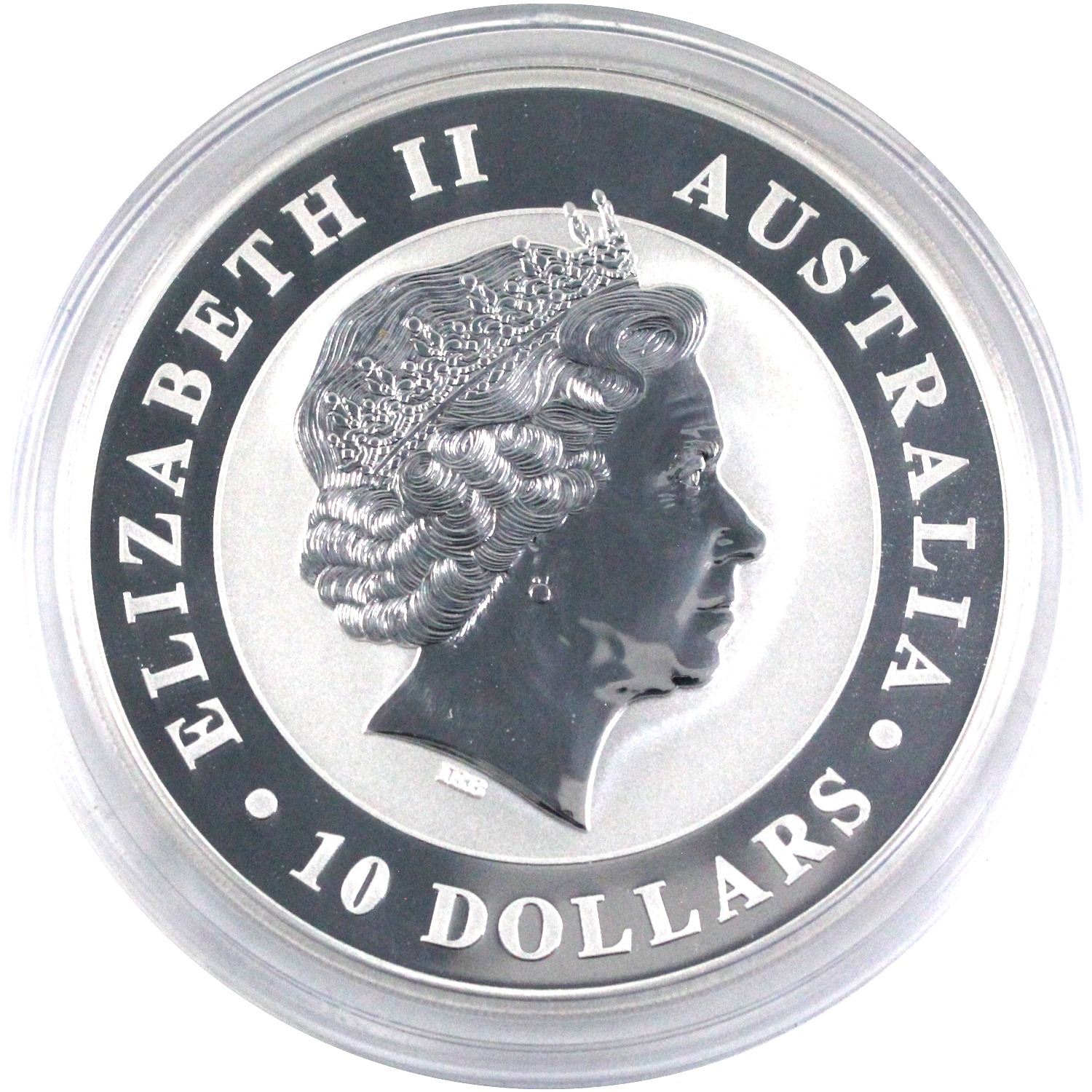 2013 Australia $10 Kookaburra 10oz .999 Fine Silver Coin in Capsule (Lightly scratched capsule). TAX Exempt