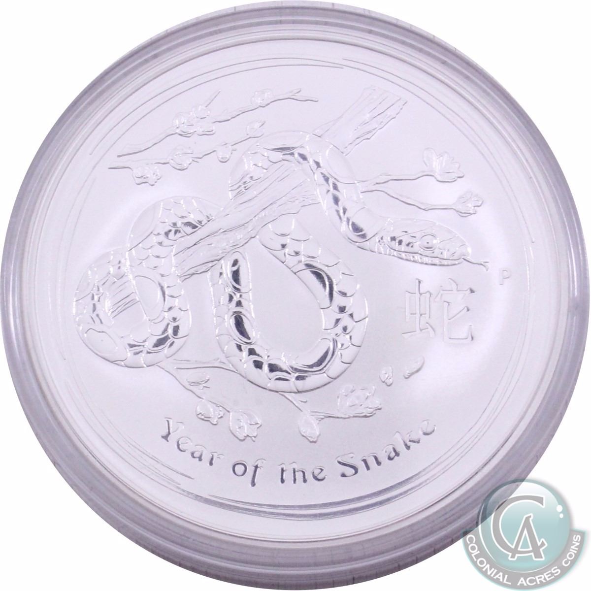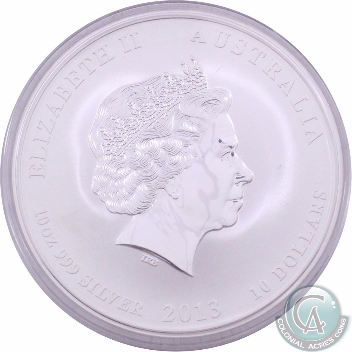 2013 Australian 10oz Year of the Snake .999 Fine Silver Coin (Tax Exempt). Capsule is lightly scratched, however the coin remains in tact.