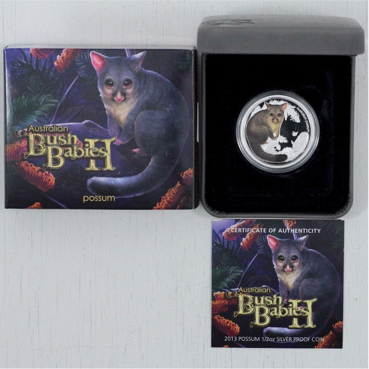 2013 Australian Bush Babies - Possum 1/2 oz Proof Silver Coin. (TAX Exempt) . Buyers Premium will be added on all items as per our terms of sale. We accept Paypal, Credit Card, E-Transfer Payments, Cheque or Money Orders (there is an additional 3% fee for using Paypal or Credit Card). All invoices will be emailed immediately following the auction, please contact us if you would like to pay by credit card or receive a new revised lower total for mailing in payment or sending an e-transfer (3% discount). All Items Are Sold "AS IS", no returns