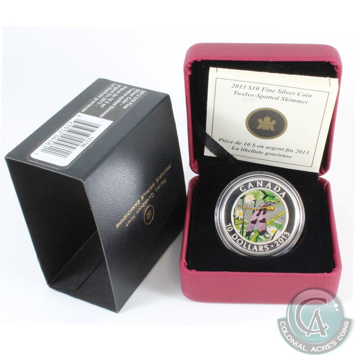 2013 Canada $10 Twelve-Spotted Skimmer Fine Silver Coin (Tax Exempt). This coin is the first in the $10 Dragonfly Series. Coin comes with all original packaging from the RCM.