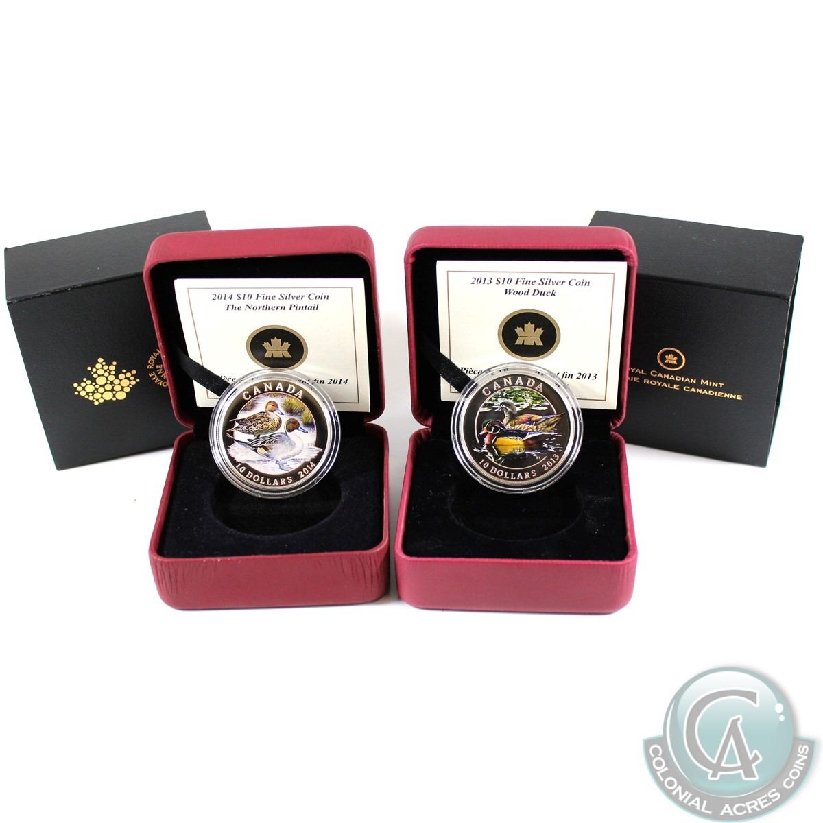2013 Canada $10 Wood Duck & 2014 $10 Pintail Duck Fine Silver Coins. 2pcs (TAX Exempt)