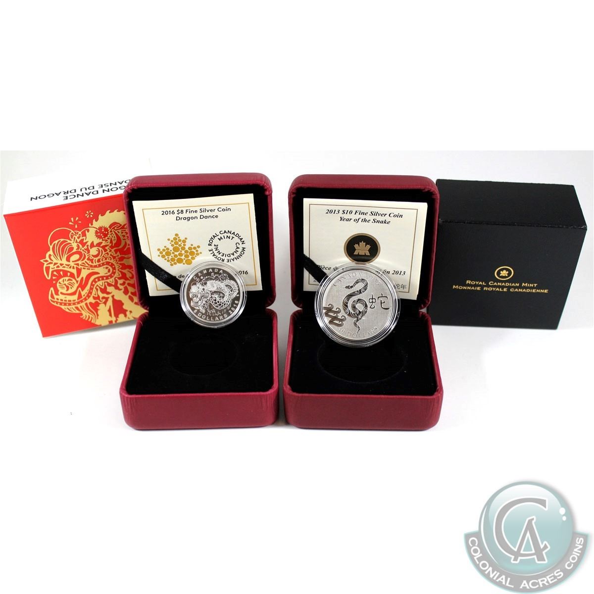 2013 Canada $10 Year of the Snake & 2016 $8 Dragon Dance Fine Silver Coins. 2pcs (TAX Exempt)
