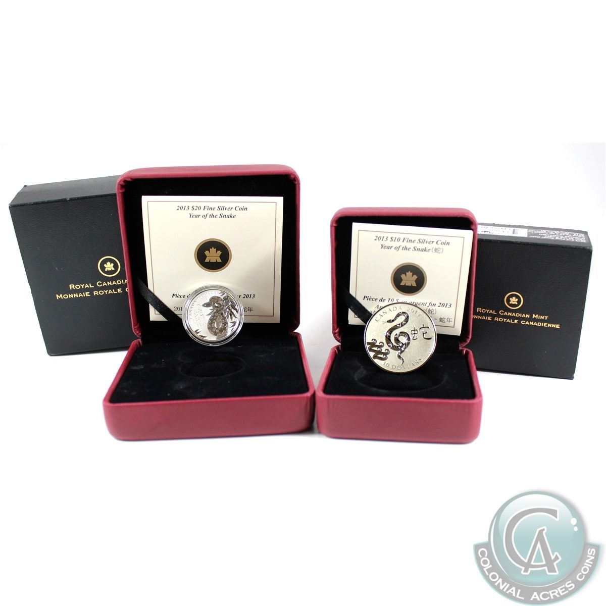 2013 Canada $10 Year of the Snake Chinese Character & 2013 $20 Year of the Snake (coin comes without capsule) Fine Silver Coins. 2pcs (TAX Exempt)