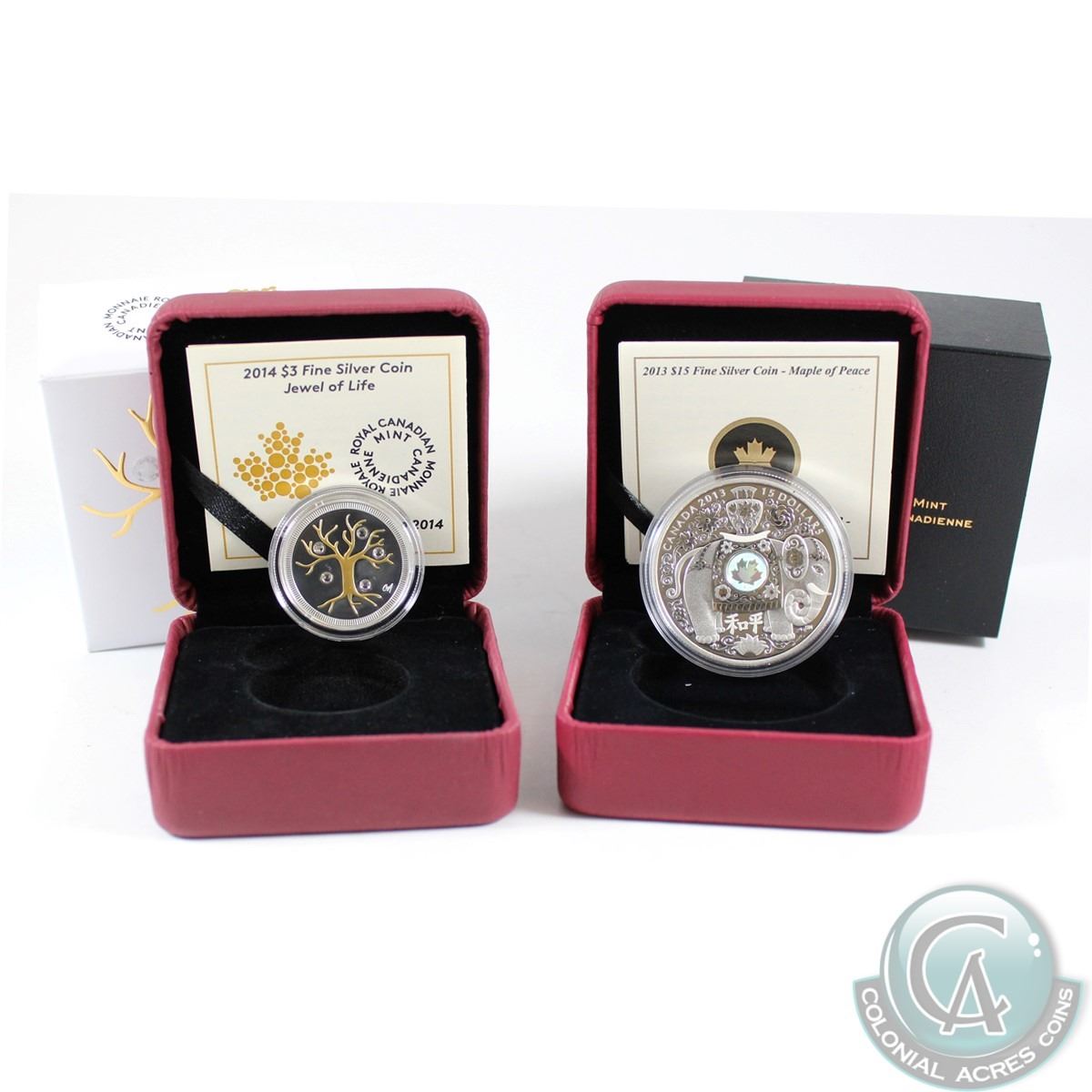 2013 Canada $15 Maple of Peace & 2014 $3 Jewel of Life Fine Silver Coins. 2pcs (TAX Exempt)