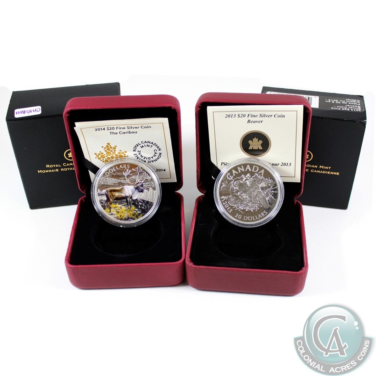 2013 Canada $20 The Beaver & 2014 Canada $20 The Caribou Fine Silver Coins (Tax Exempt). Please note capsules are lightly scratched. 2pcs.