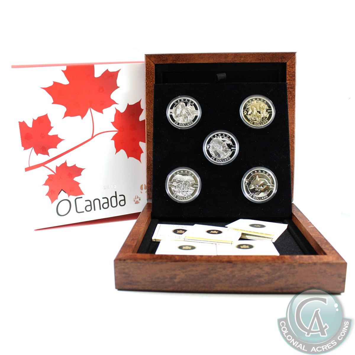 2013 Canada $25 Complete O Canada 5-Coin Fine Silver Set with Deluxe Display Case. The Wolf coin has been Gold Plated (TAX Exempt)