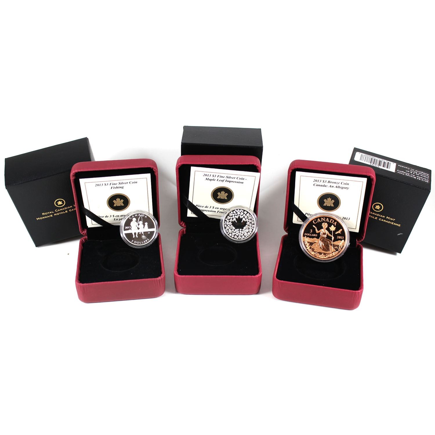 2013 Canada $3 Maple Leaf Impression, 2013 $3 Fishing & 2013 $3 Canada: An Allegory Fine Silver Coins. 3Pcs (TAX Exempt)