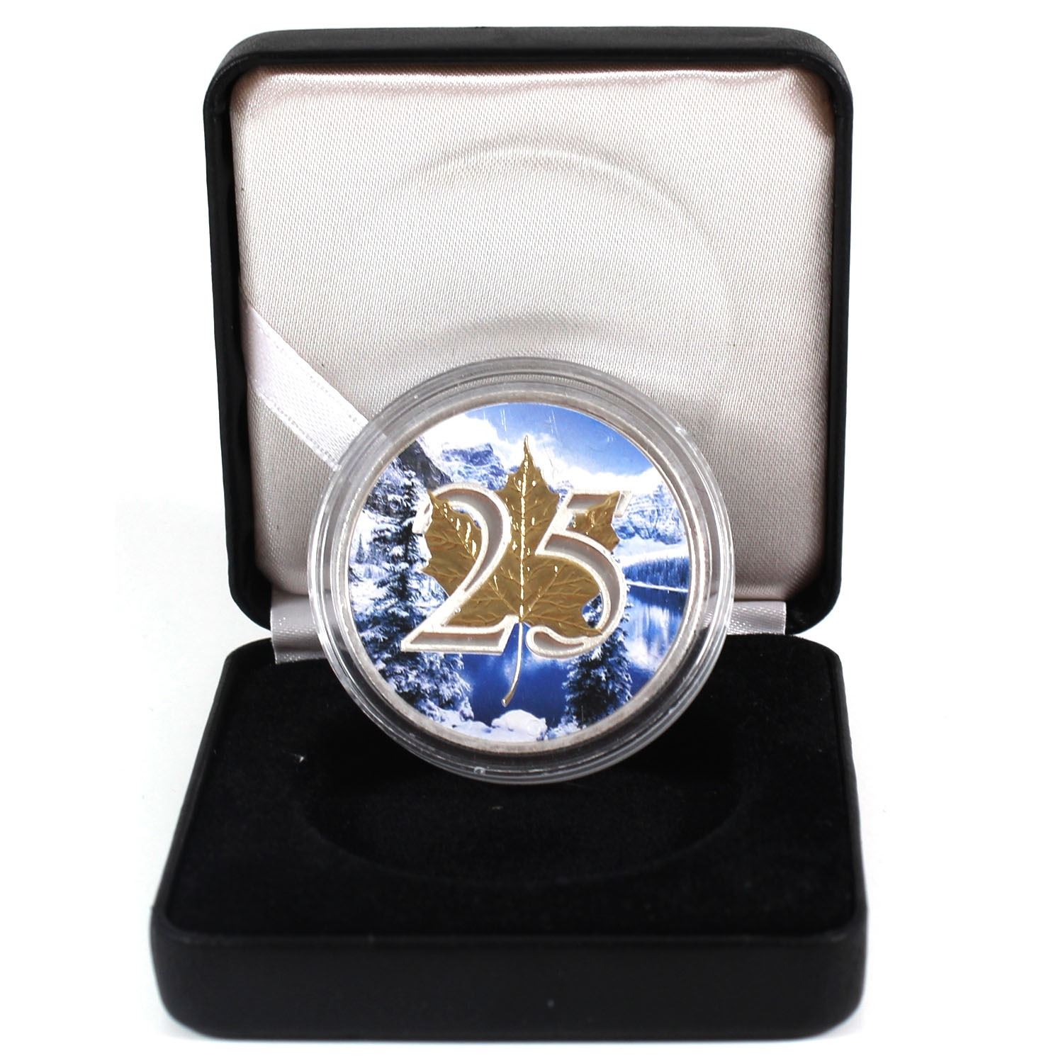 2013 Canada $5 Coloured/Gilt 'Winter Landscape' 25th Anniversary 1oz Fine Silver Maple (Tax Exempt) Coin comes encapsulated in black presentation case. Please note capsule and coin contain scratches.