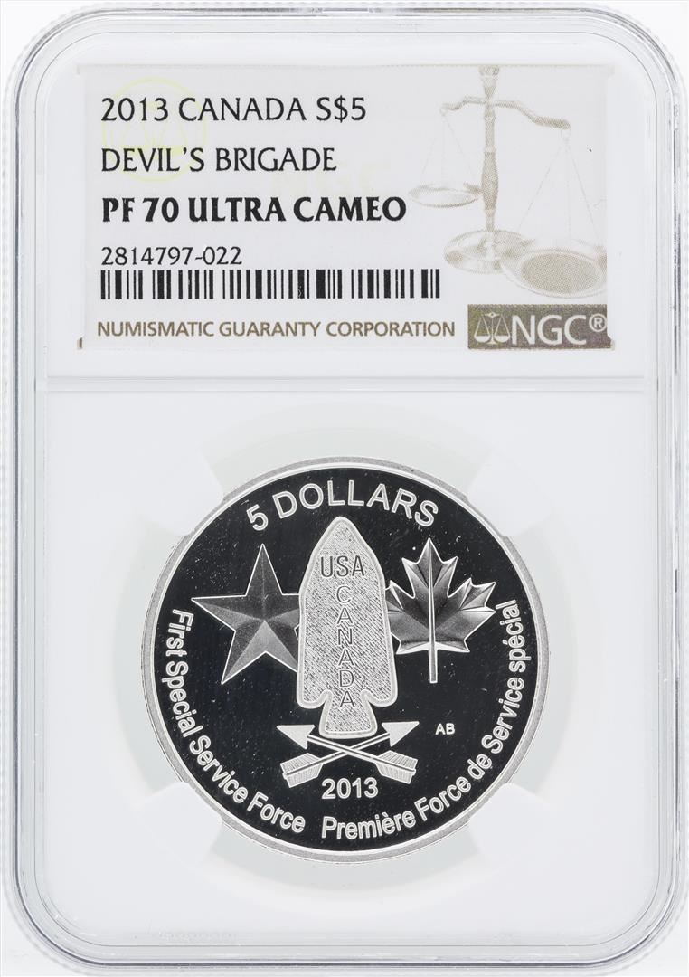 One 2013 Canada $5 Devils Brigade Silver Coin NGC PF70 Ultra Cameo.