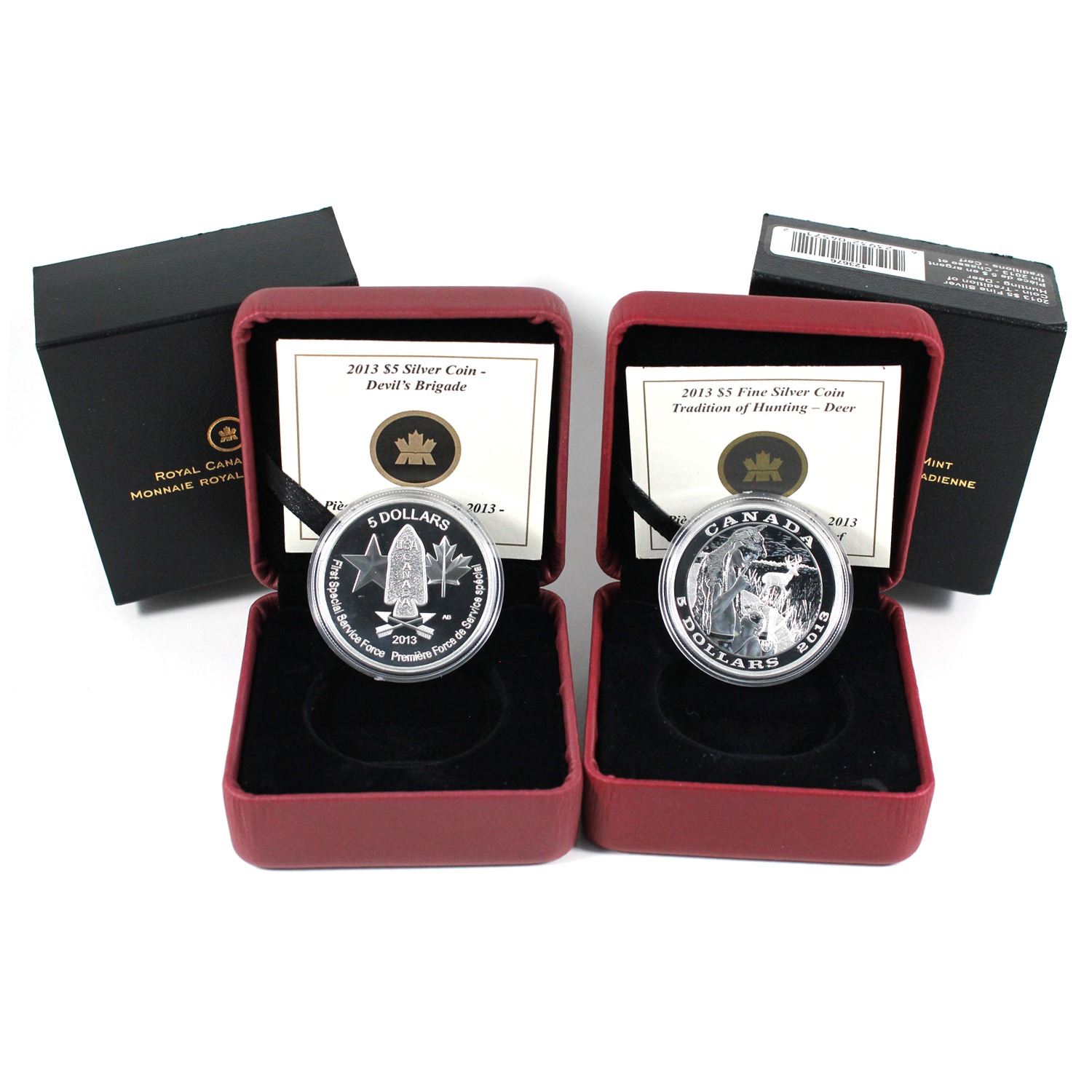 2013 Canada $5 Fine Silver Coins - Tradition of Hunting - Deer & Devil's Brigade (Deer display case felt has a small tear & Devil's Brigade capsule lightly scratched). 2pcs (TAX Exempt)