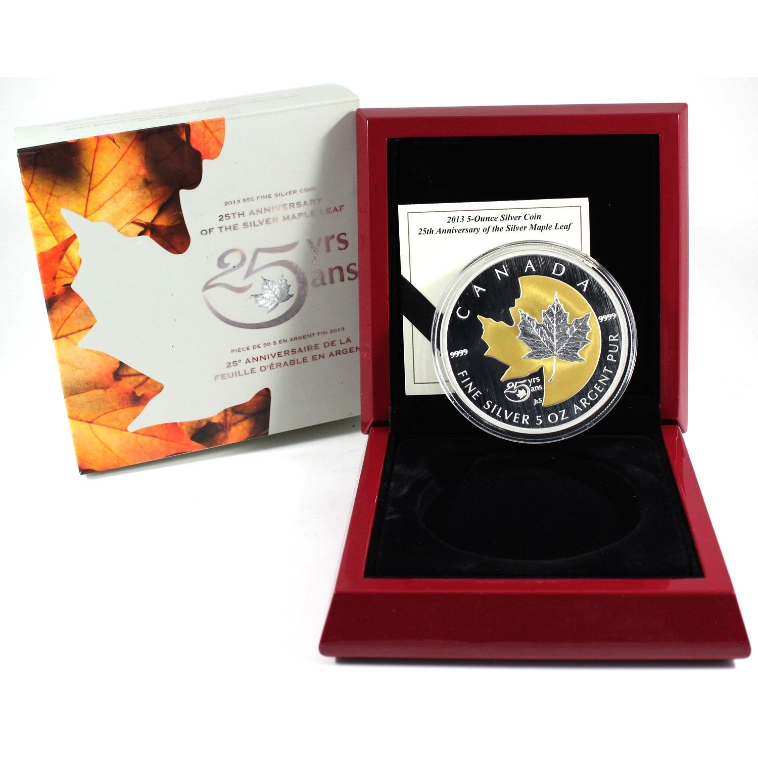 2013 Canada $50 25th Anniversary of the Silver Maple Leaf 5oz Fine Silver Coin with Gold Plating (Sleeve is impaired & capsule is lightly scuffed). TAX Exempt