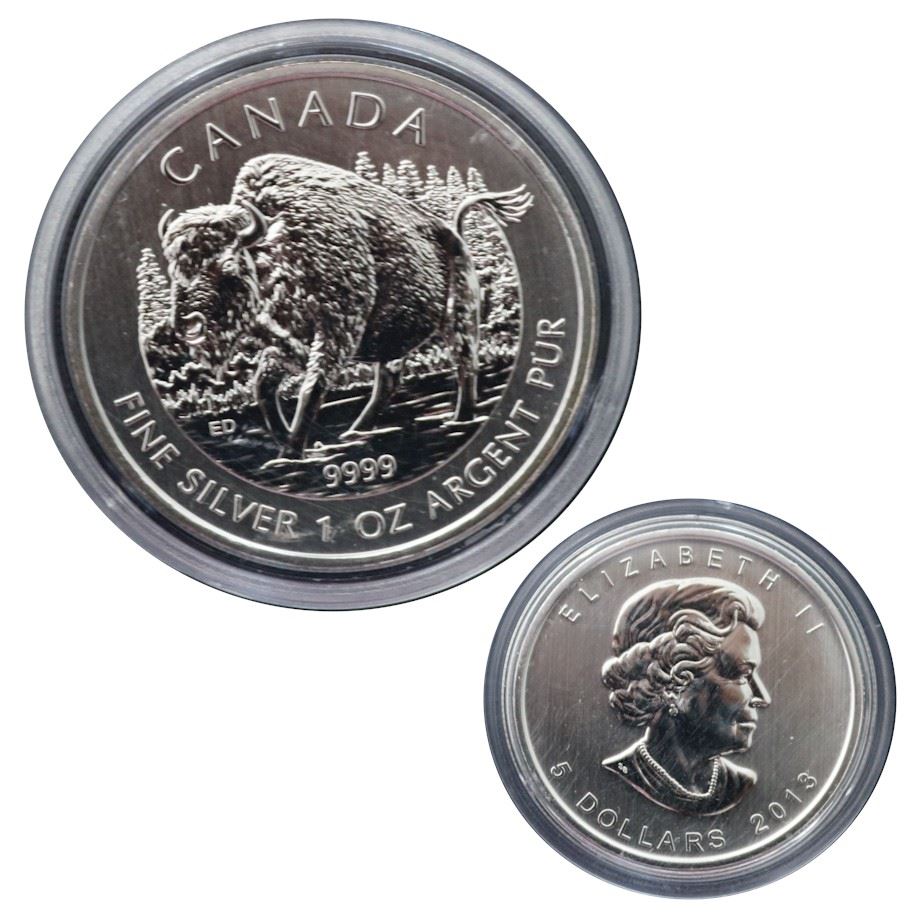 2013 Canada Bison 1oz $5 Commemorative Silver Maple Leaf in capsule. The coin has very light toning. (TAX EXEMPT)