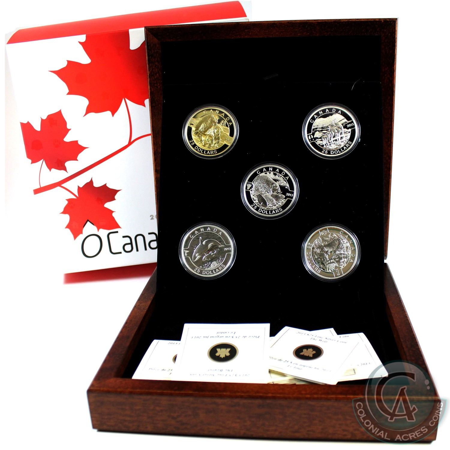 2013 Complete $25 O Canada 5-coin Set with Deluxe RCM Issued Box (Tax Exempt). Polar Bear coin appear to be gold plated.