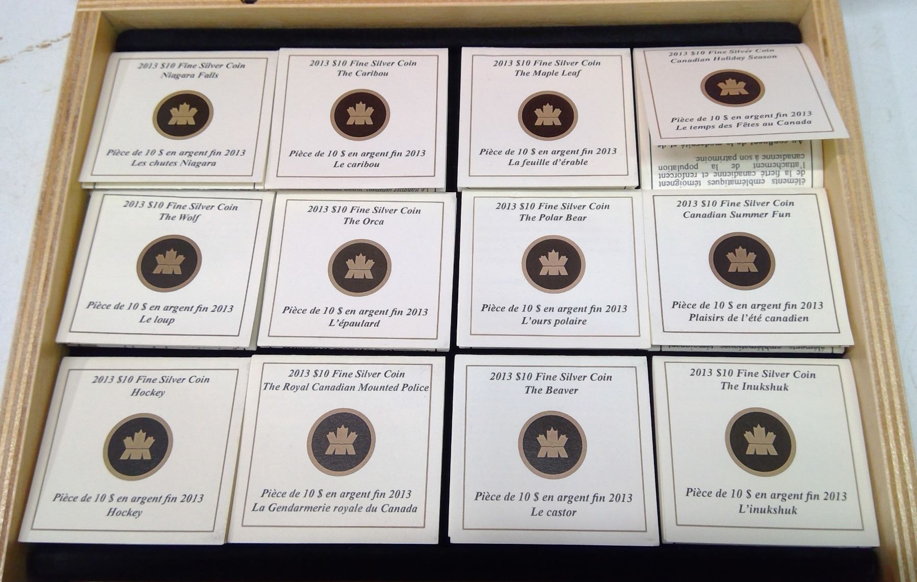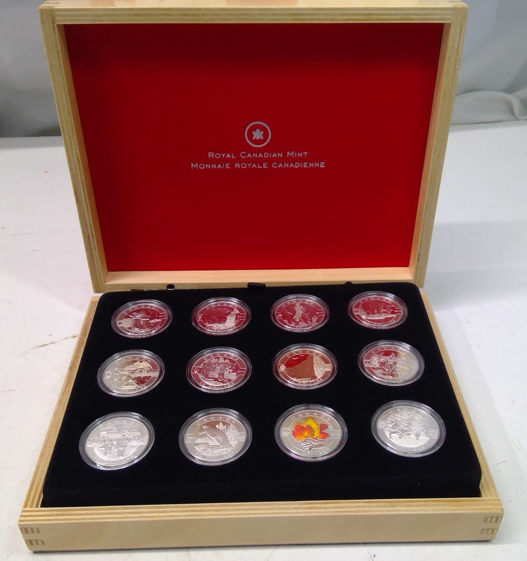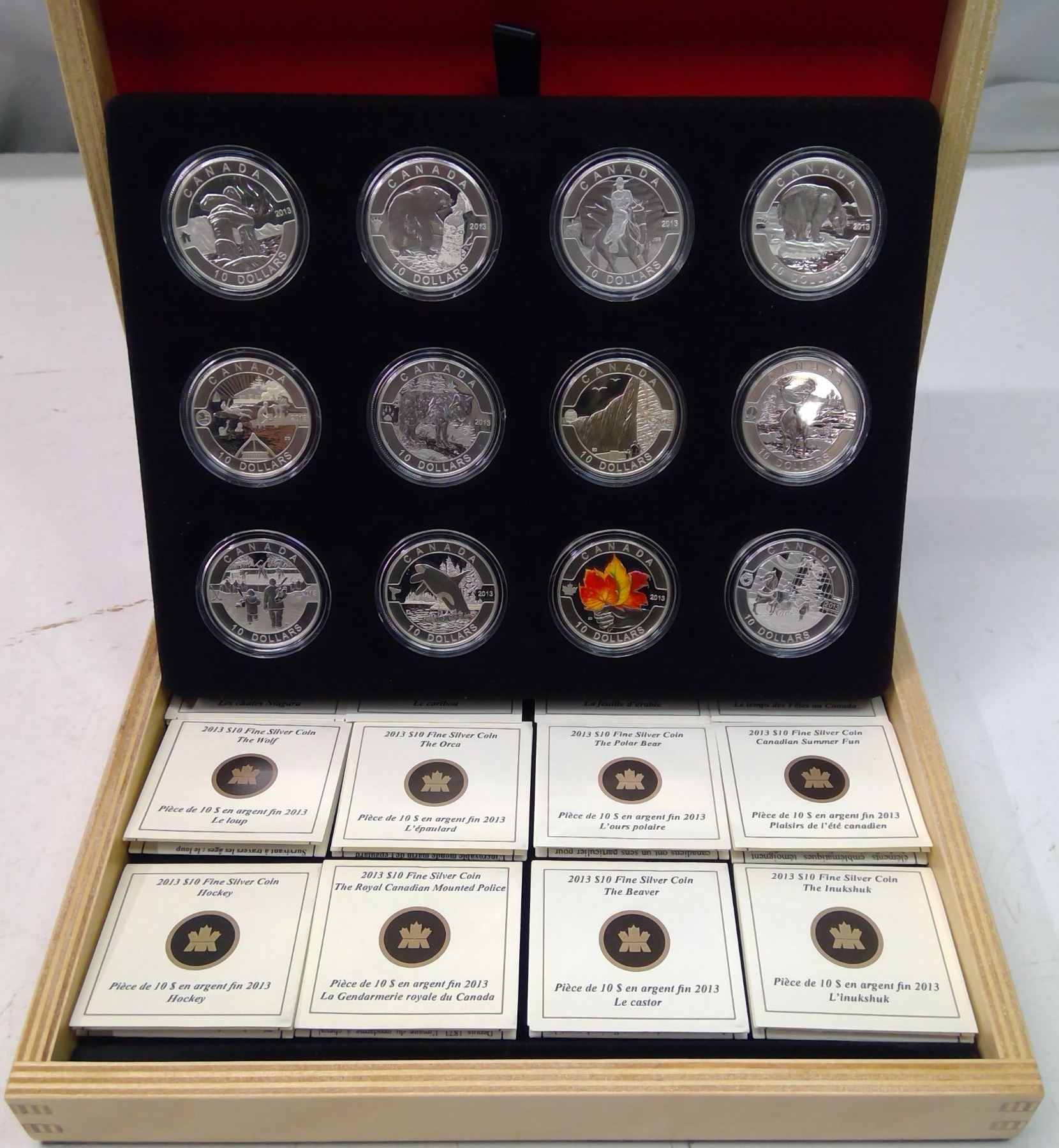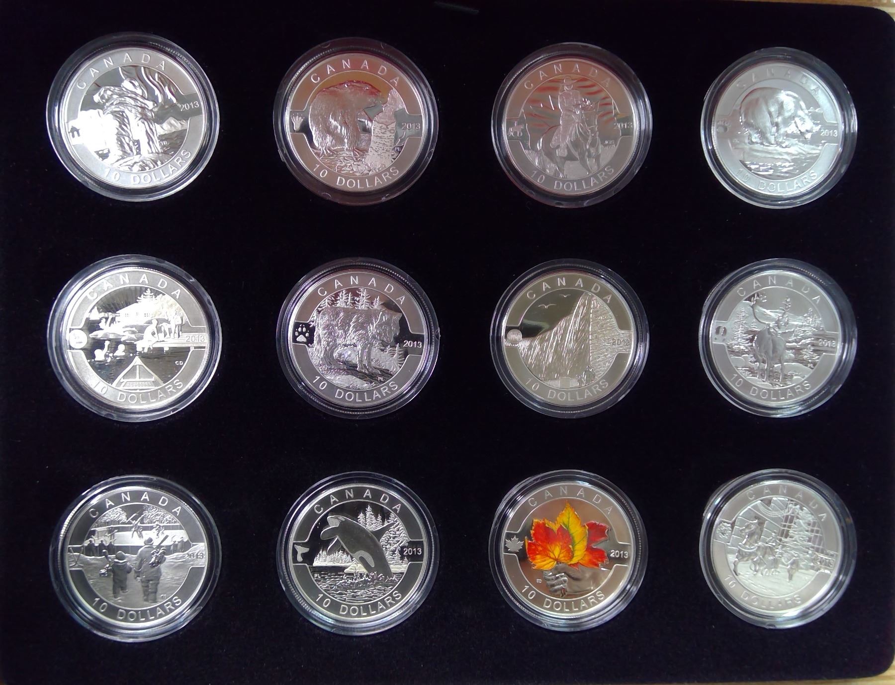 2013 Complete set of 12 $10 coins. Includes Inukshuk, Beaver, RCMP, Polar Bear, Canadian Summer Fun, Wolf, Niagara Falls, Caribou, Hockey, Orca, Colourized Maple Leaf & Canadian Holiday Season. All coins are 99.99% pure Silver. Proof with Ultra Heavy Cameo. Housed in its original wooden Royal Canadian Mint case & box of issue. Includes Certificate of Authenticity. Scarce.