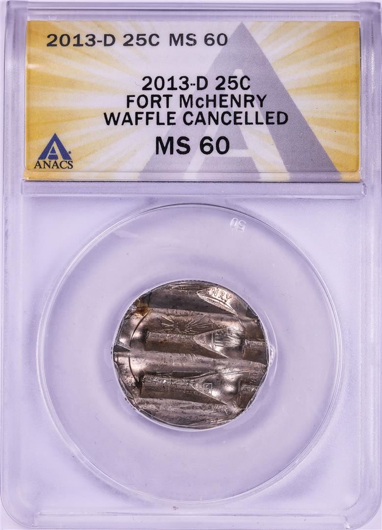 One 2013-D Fort McHenry ATB Quarter Waffle Cancelled Coin ANACS MS60. ANACS Certified.
