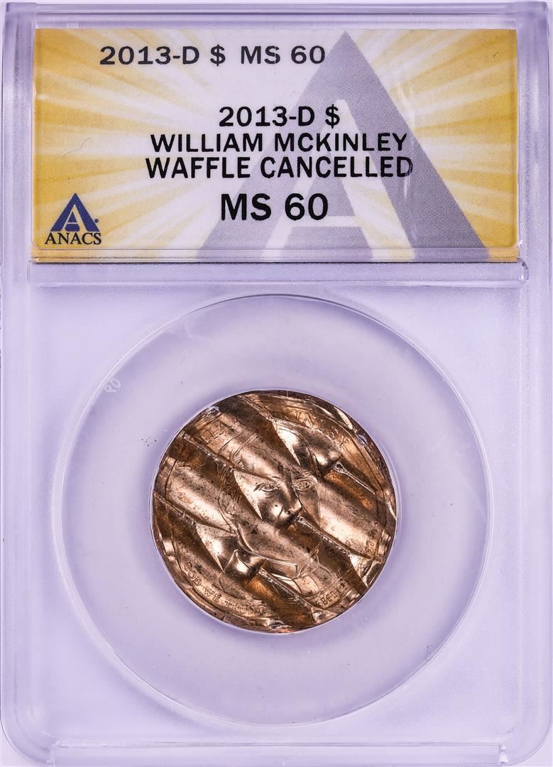 One 2013-D William McKinley Presidential Dollar Waffle Cancelled Coin ANACS MS60. ANACS Certified.