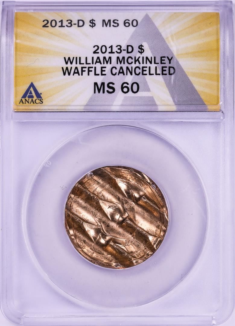 One 2013-D William McKinley Presidential Dollar Waffle Cancelled Coin ANACS MS60. ANACS Certified.
