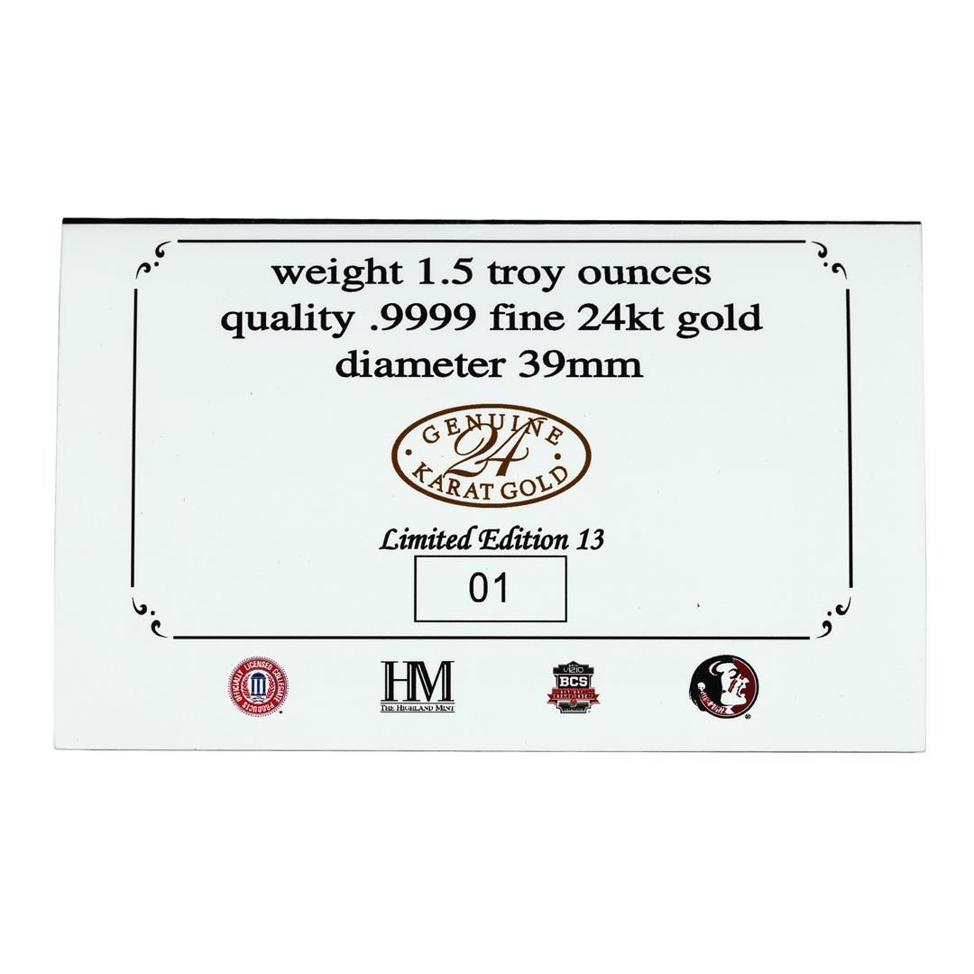 One 2013 Florida State National Champions 1.5 oz 24kt Gold Medal Limited Edition 1 of 13.