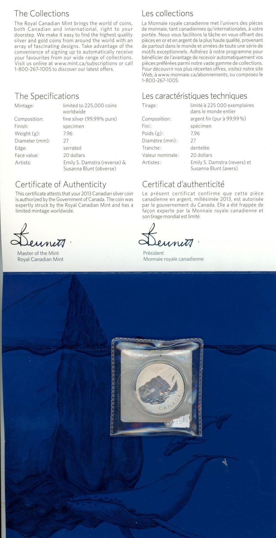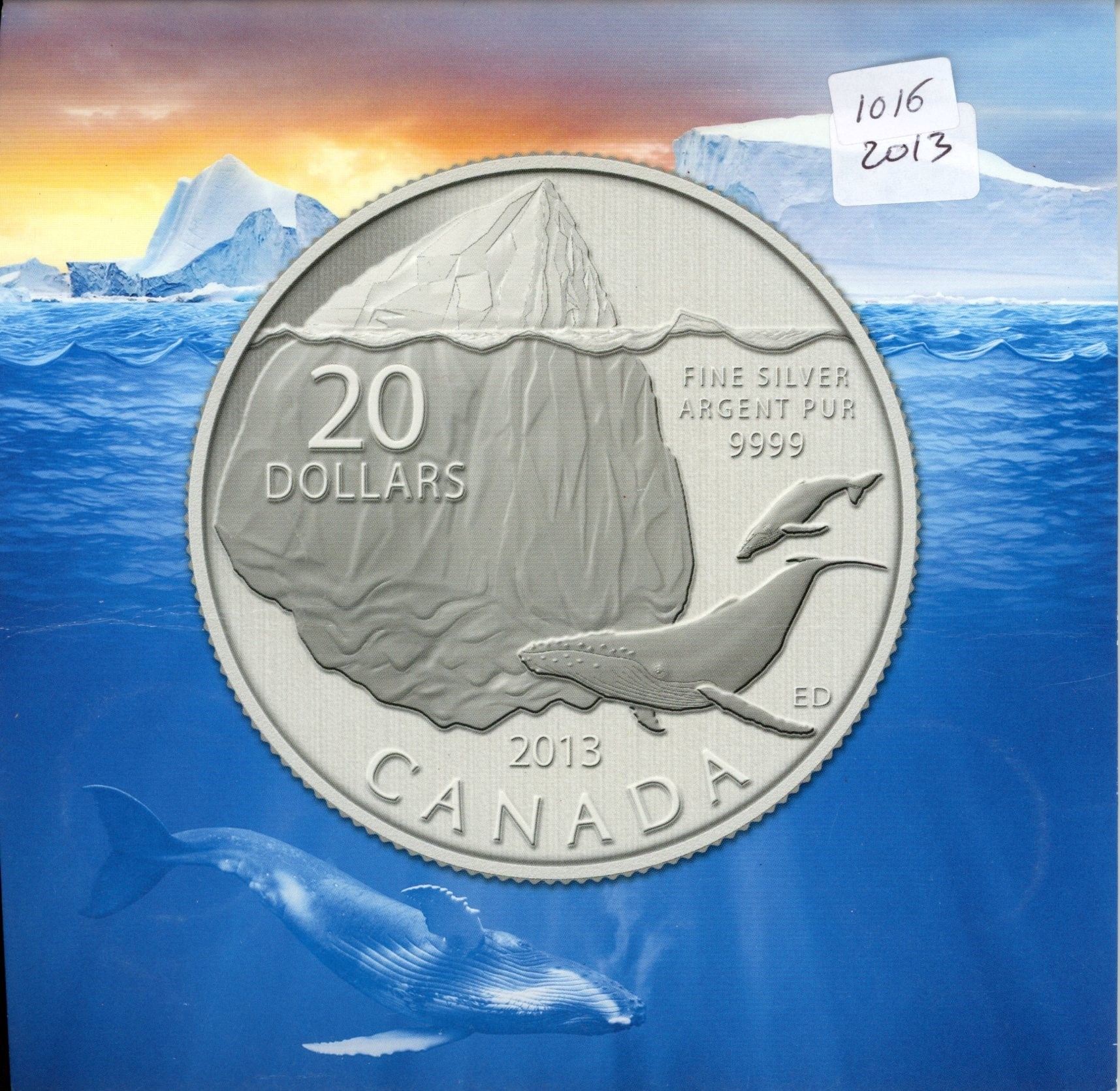 2013 Iceberg with whales Silver $20. .9999 pure silver. Housed in folder of issue.
