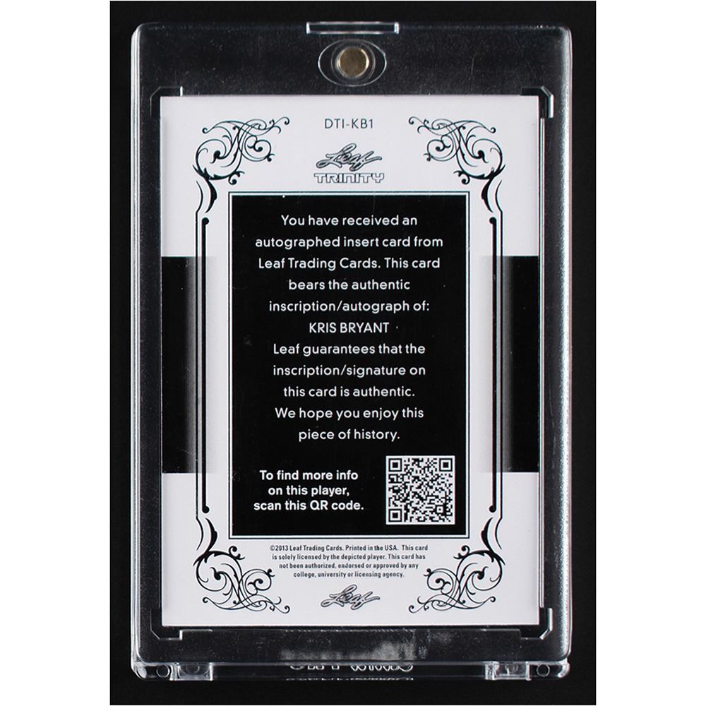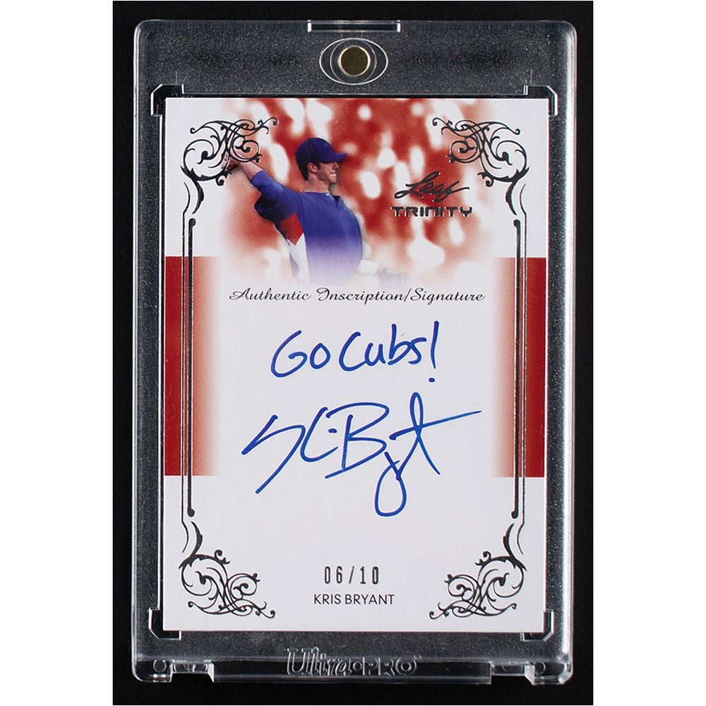 Prominently autographed pre-rookie card of Chicago phenom Kris Bryant, numbered 6/10, boldly signed in blue felt tip, "Go Cubs! Kris Bryant." A marvelous inscription from the future Rookie of the Year.