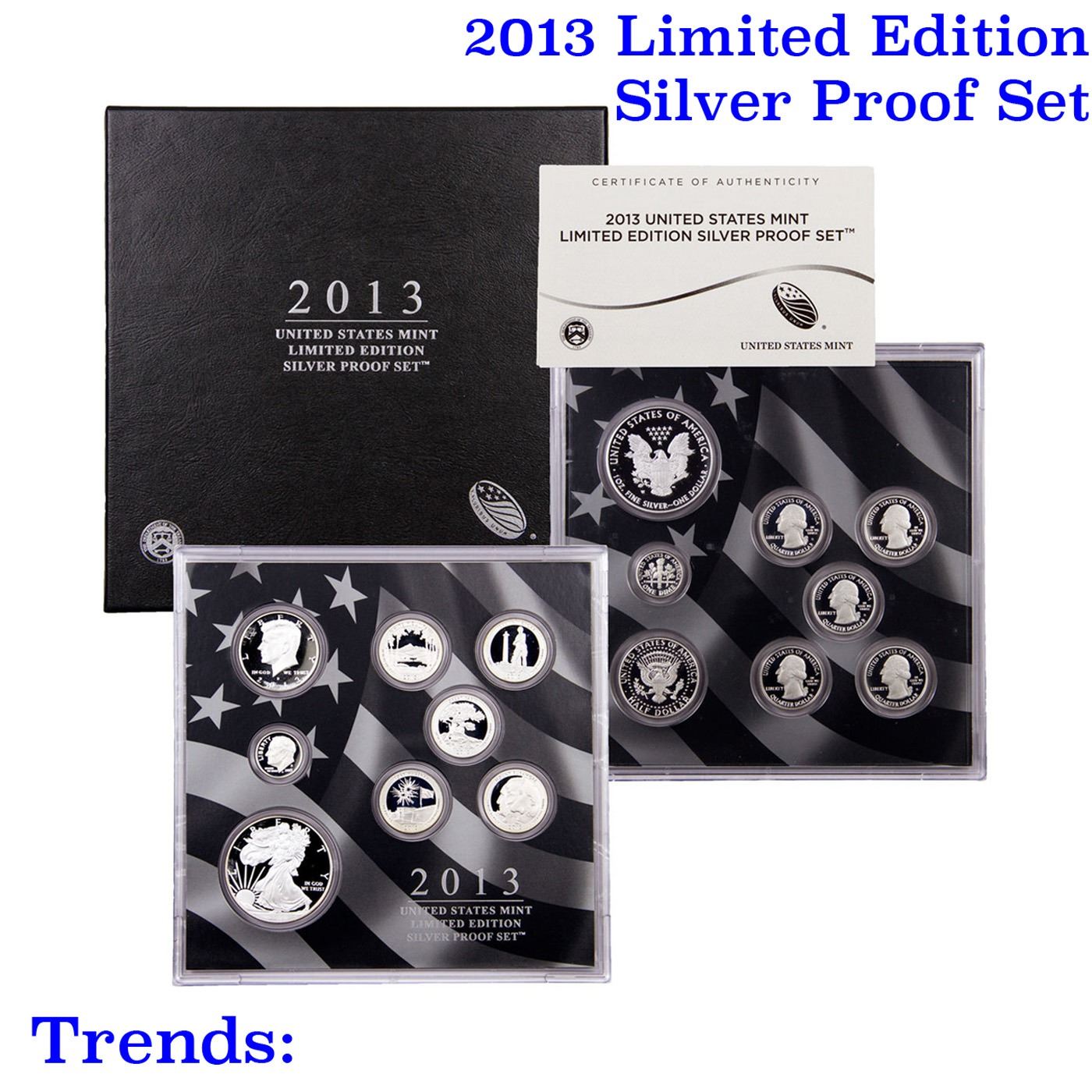 2013 Limited Edition Silver Proof Set . 2013 United States Mint Limited Edition Silver Proof Set contains eight silver coins, the 5 2013-S National Parks quarters (White Mountain National Forest, Perry’s Victory and International Peace Memorial, Great Basin National Park, Fort McHenry National Monument and Historic Shrine, Mount Rushmore National Memorial) , as well as a 2013-S Roosevelt dime, 2013-S JFK half dollar and 2013-W Proof Silver Eagle. Limited mintage of only 50,000 sets. Contains over 1.25Oz of Pure silver