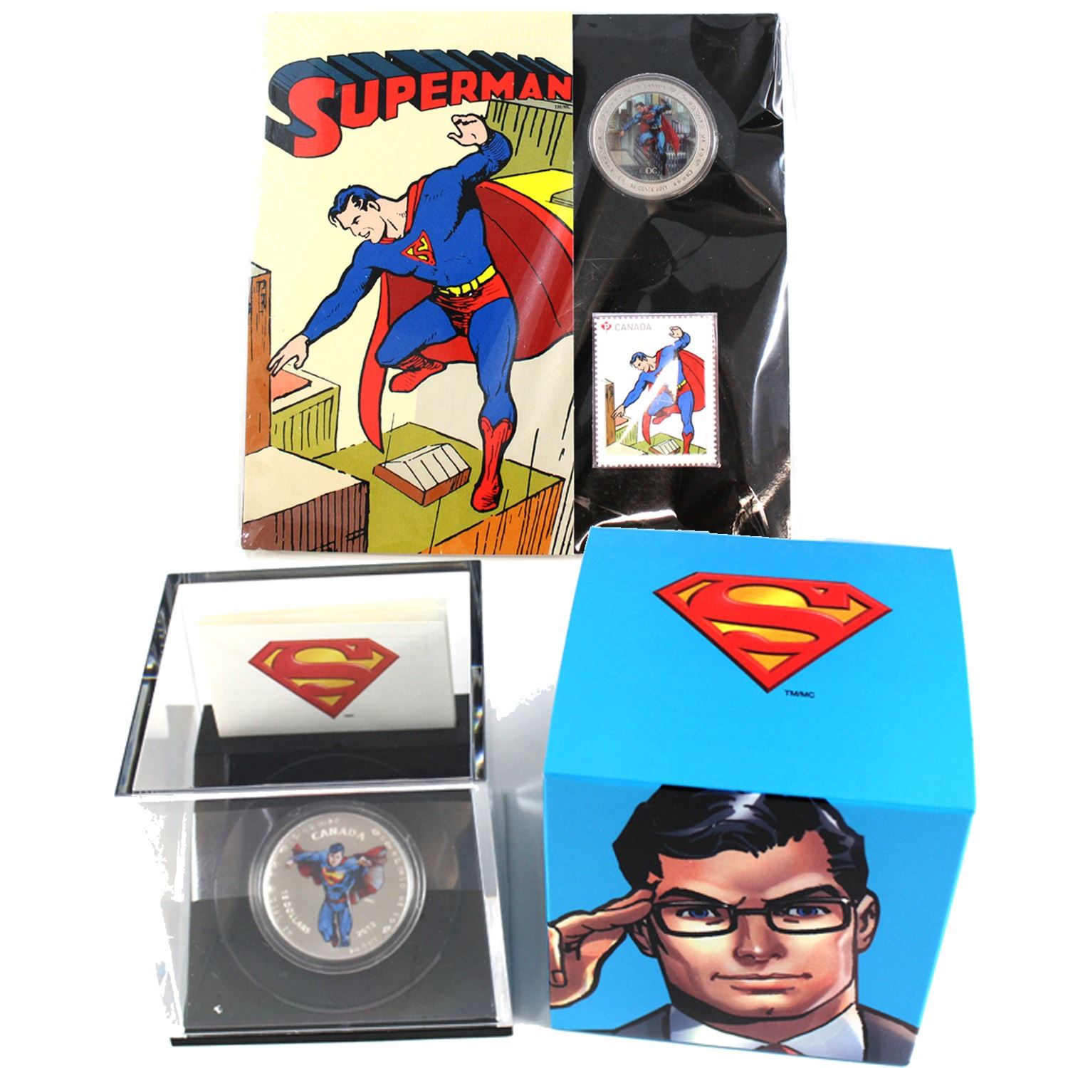 2013 Modern Day Superman $20 Fine Silver coin & 2013 Canada 50-cent Superman: Then and Now Lenticular Coin & Stamp Set. 2pcs