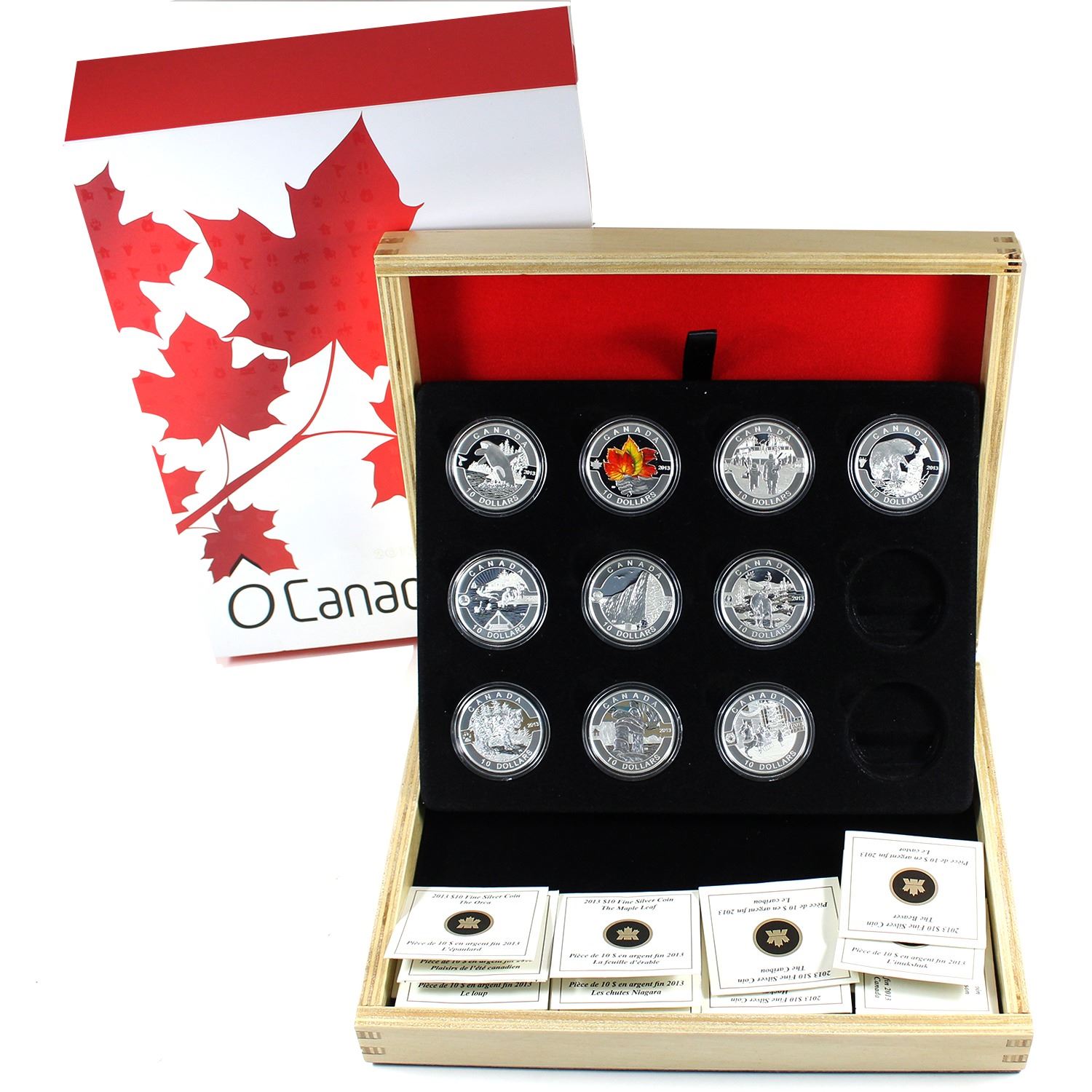 2013 O Canada $10 12-Coin Set with 10-coins and Deluxe Box (No Tax). Includes Orca, Leaves, Hockey, Beaver, Summer Fun, Niagara Falls, Caribou, Wolf, Inukshuk, and Holiday.