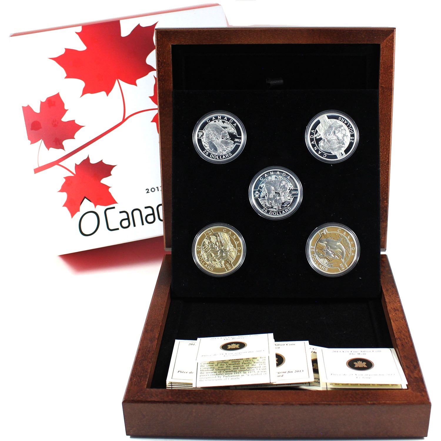 2013 O Canada $25 5-Coin Set in Deluxe Wooden Box (No Tax). Comes with all original packaging. Caribou and orca are toned.