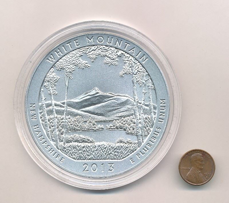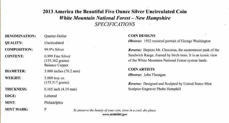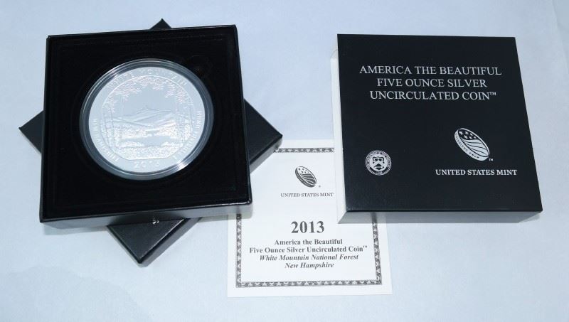 2013-P AMERICA THE BEAUTIFUL 5 OZ SILVER UNCIRCULATED COIN WHITE MOUNTAIN NATIONAL FOREST, NH OGP