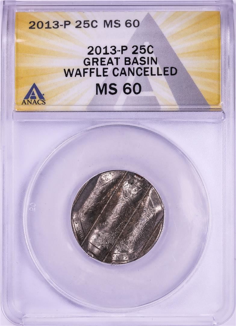 One 2013-P Great Basin ATB Quarter Waffle Cancelled Coin ANACS MS60. ANACS Certified.