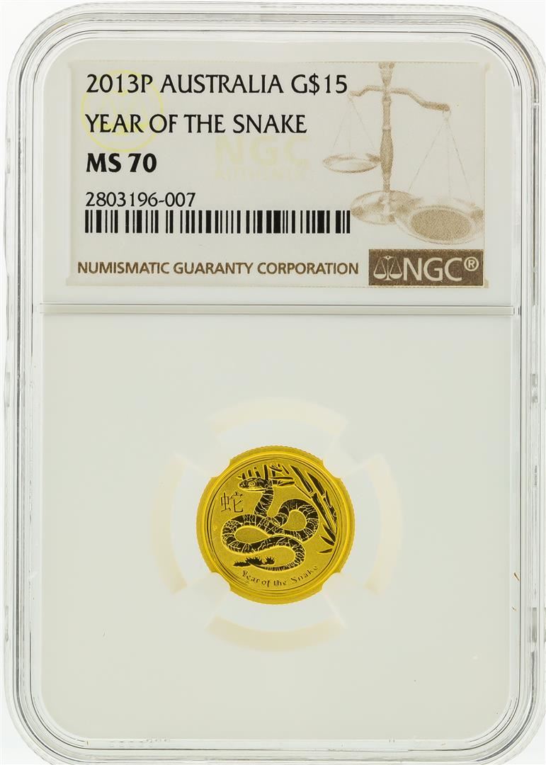 One 2013-P NGC MS70 Australia $15 Year of the Snake 1/10 Oz. Gold Coin. NGC Certified.