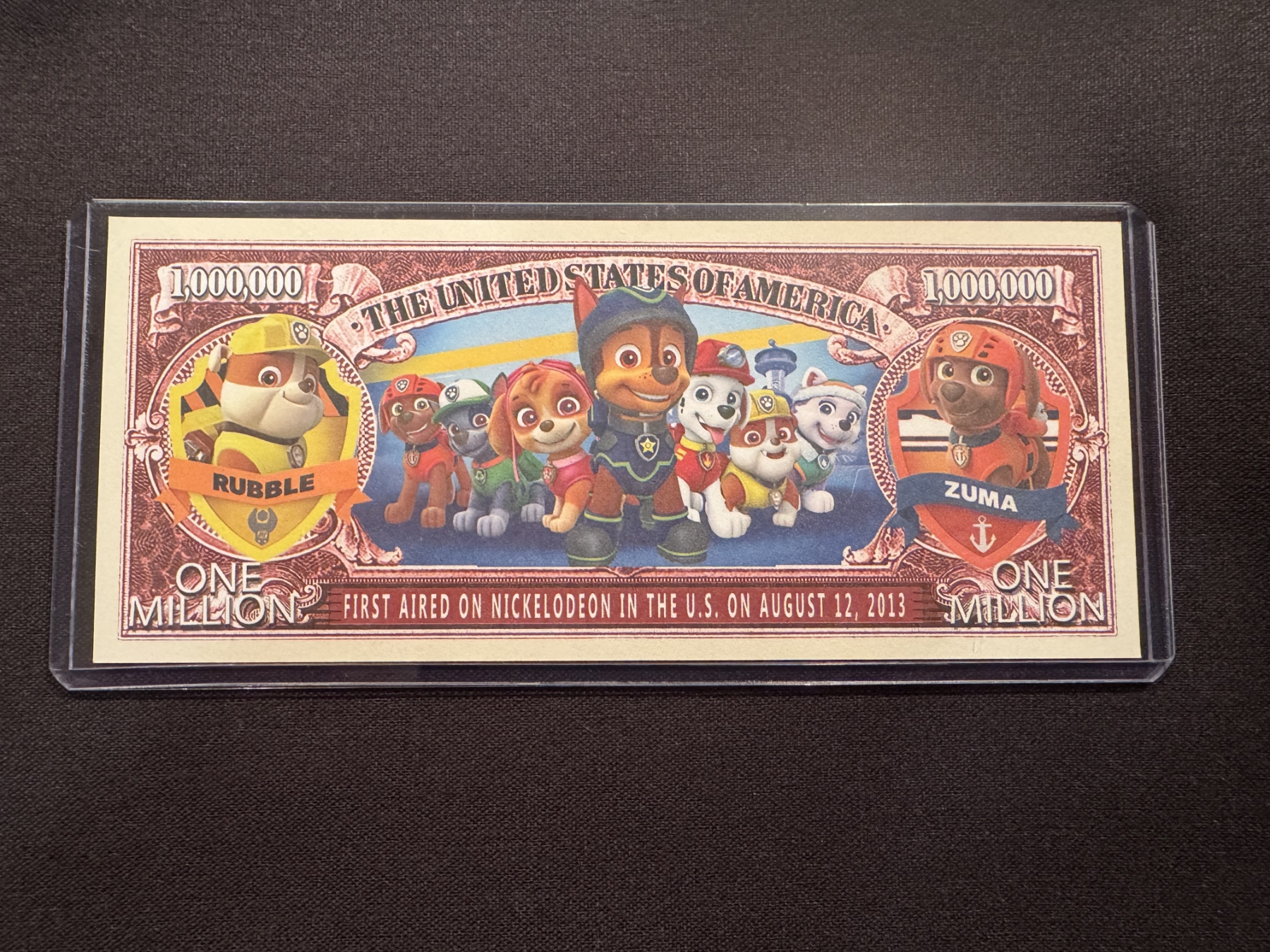 2013 Paw Patrol One Million Dollar Bill In Protective Holder - Mint Condition