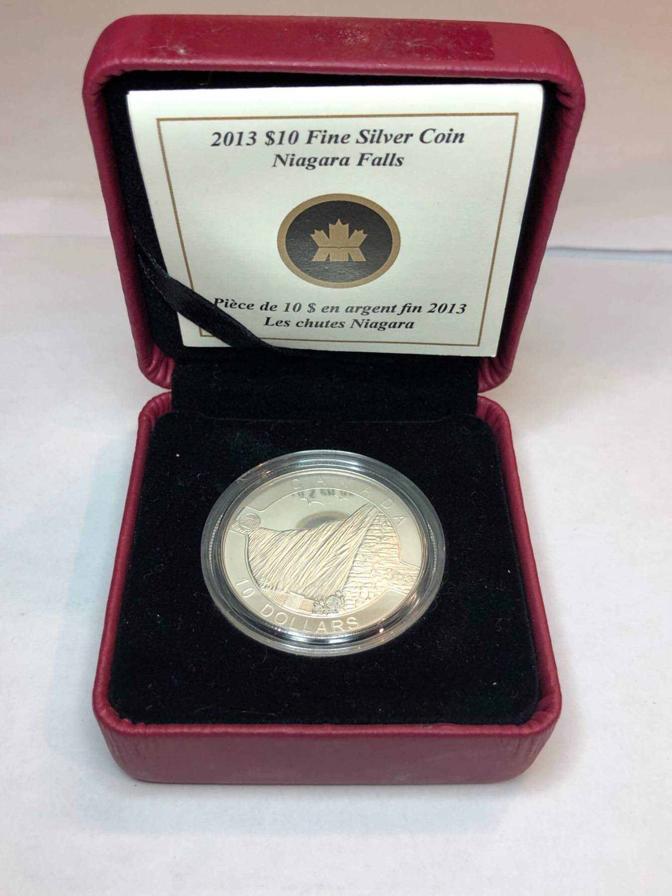 2013 Royal Canadian Mint $10 Fine Silver Coin - Niagara Falls This $10 coin is 99,99% pure silver and weighs 15,87grams The design features a family viewing the Niagara Falls from an observation deck