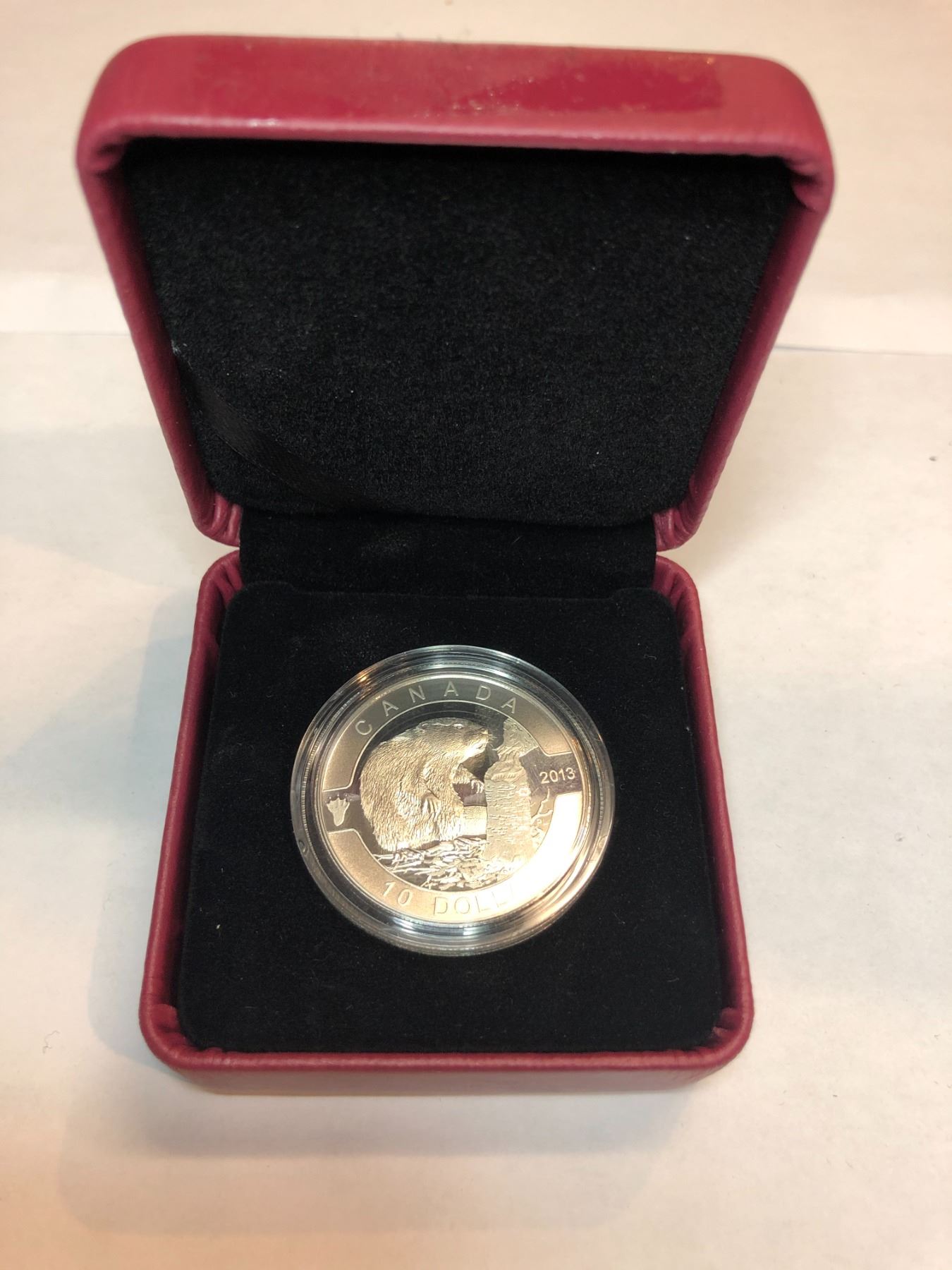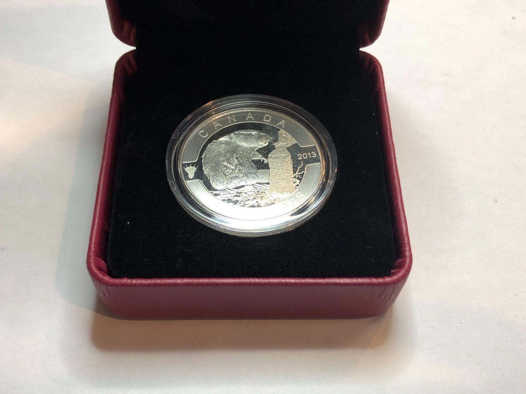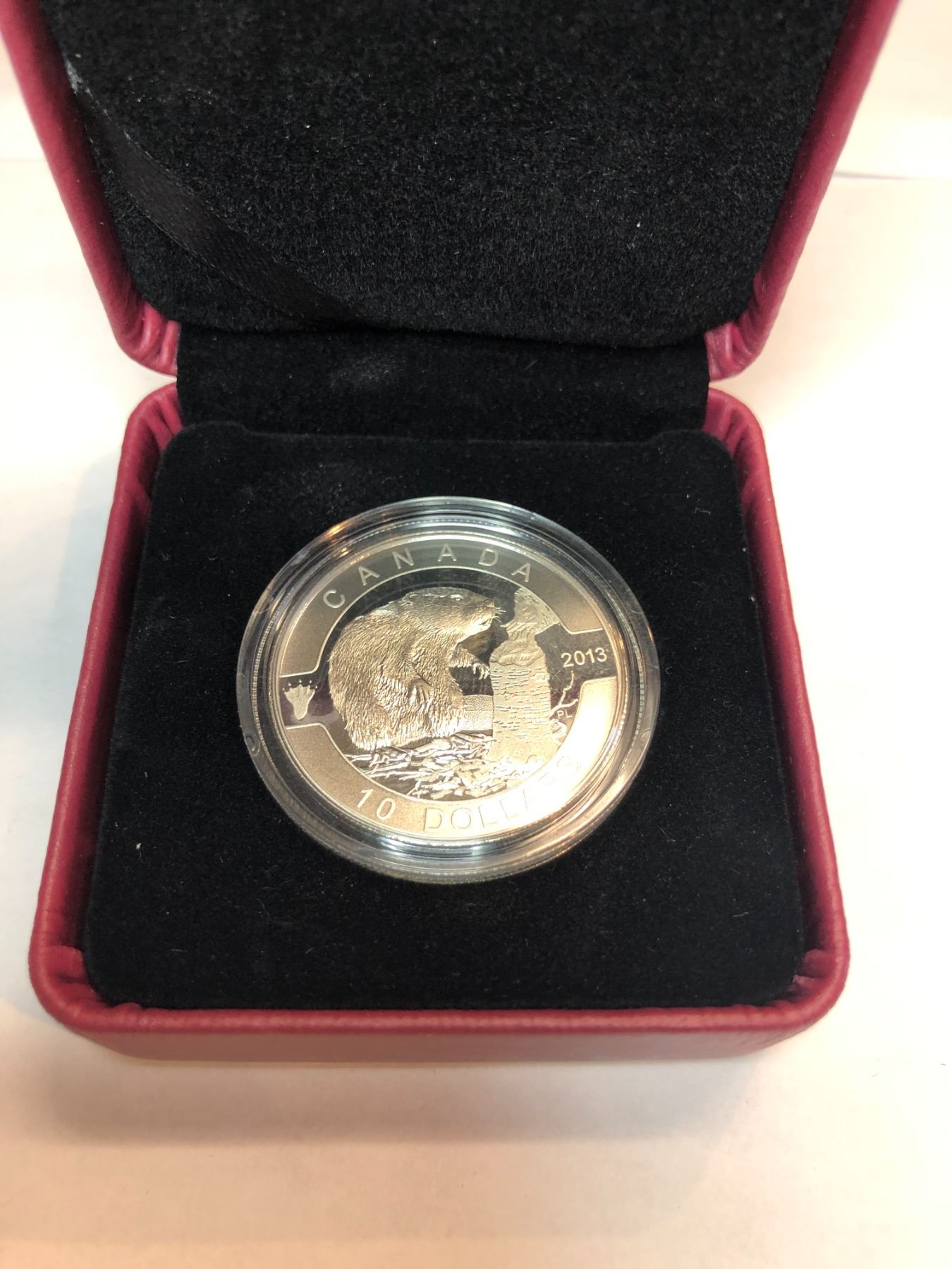2013 Royal Candian Mint $10 Fine Silver Coin This $10 coin is 99.99% Fiine Silver and weighs 15.87 grams The design features a beaver felling a birch tree