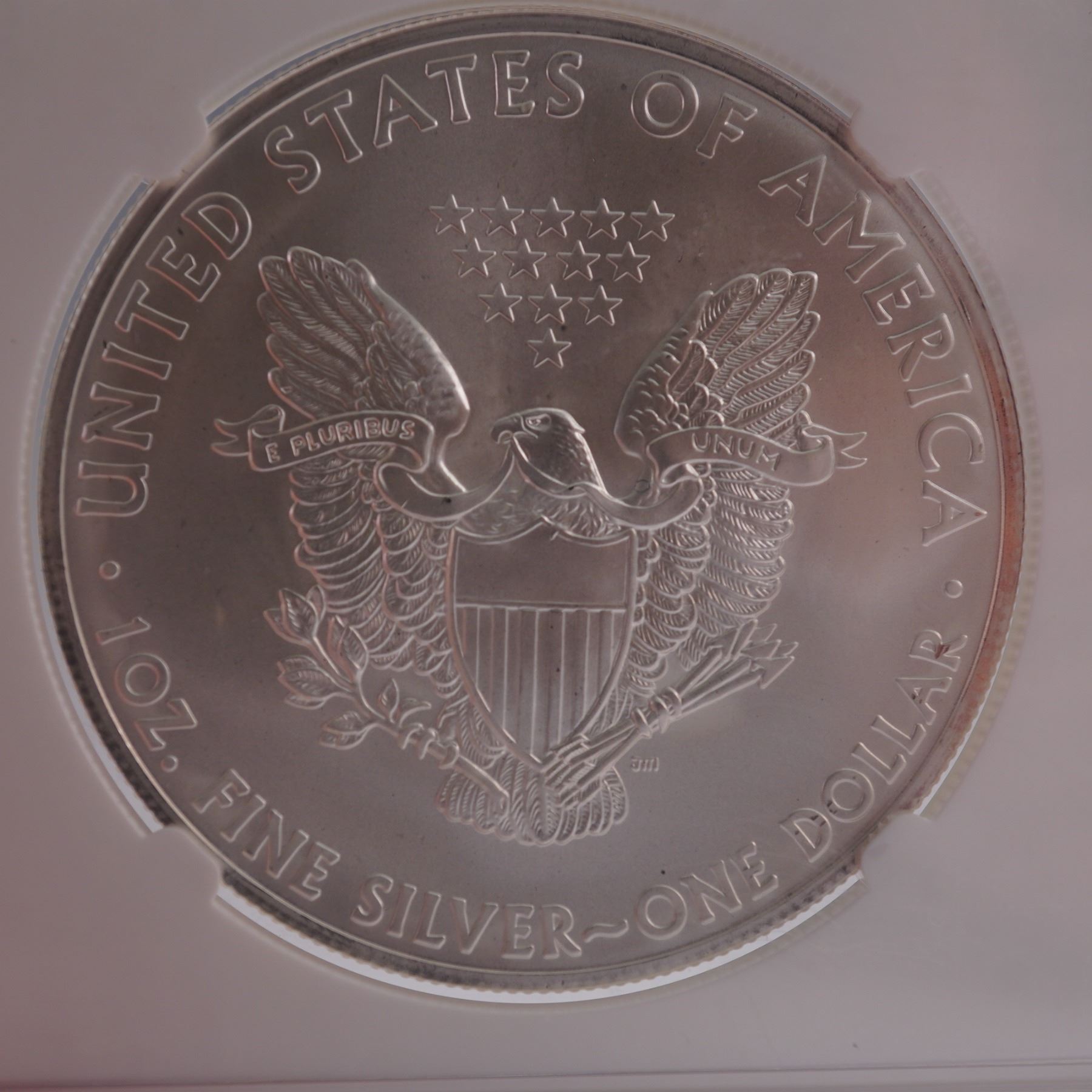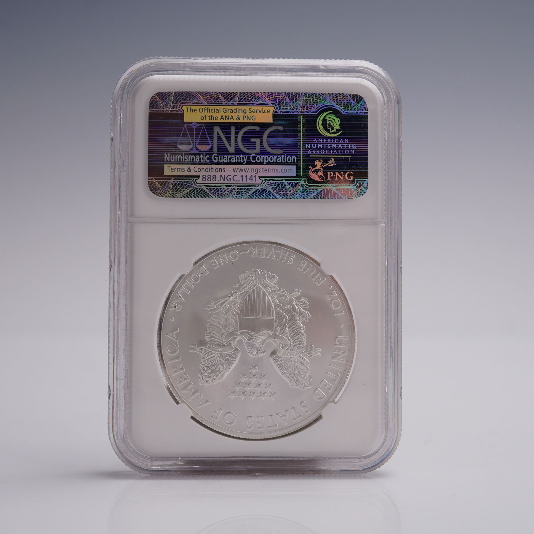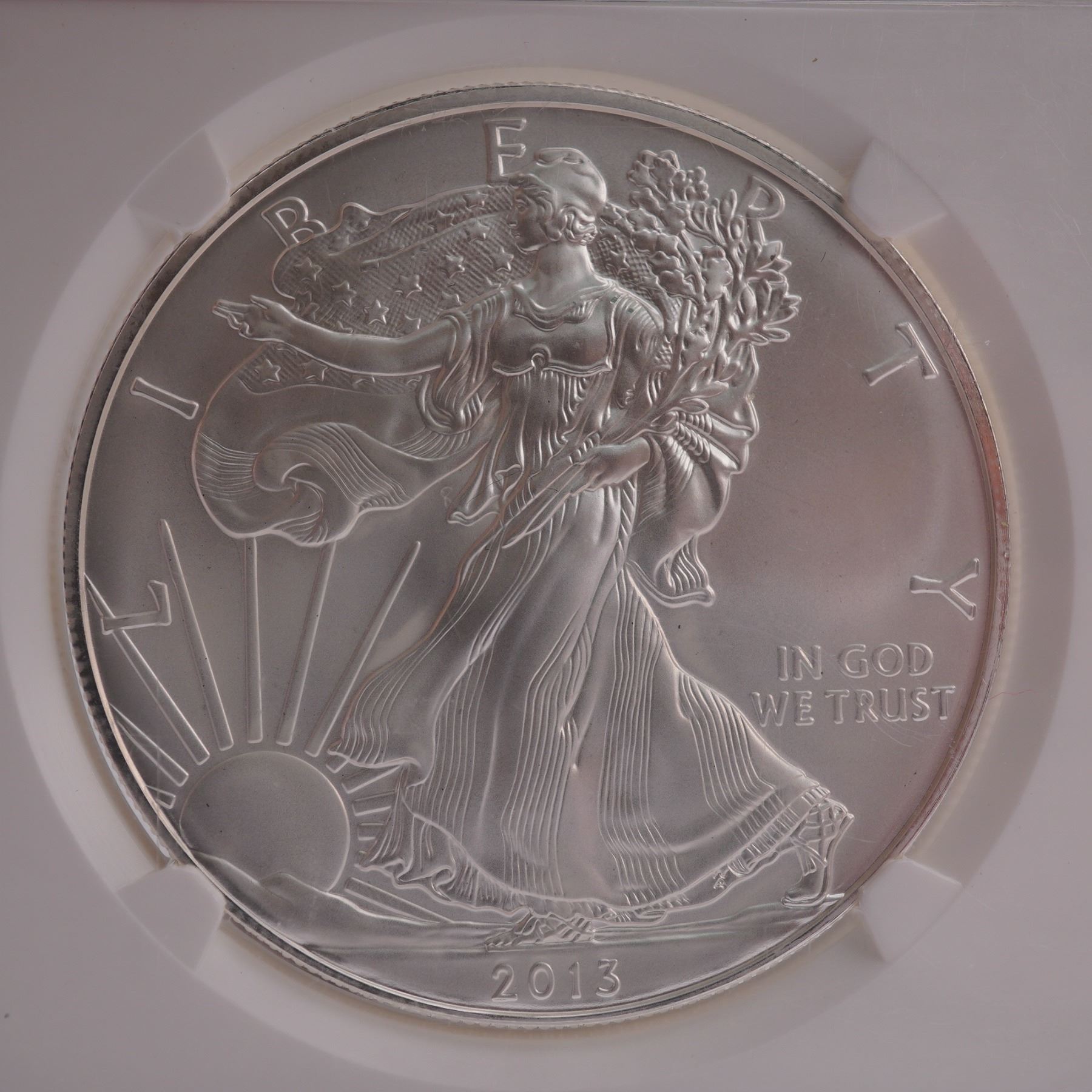 An exceptional 2013 American Silver Eagle One Dollar Coin, certified and encapsulated by the Numismatic Guaranty Corporation (NGC). Struck in one troy ounce of .999 fine silver. The obverse presents Adolph A. Weinman's immortal "Walking Liberty" design, shown striding toward the sunrise, her right arm extended in hopeful gesture, and her left holding a bouquet of oak and laurel branches. She is framed by rising sunbeams and the inscription LIBERTY, while the motto IN GOD WE TRUST appears to her right, above the date 2013. The reverse, sculpted by John Mercanti, displays a heraldic eagle with wings fully spread behind a striped shield. In its talons, the eagle grips an olive branch and arrows, evoking both peace and preparedness. A constellation of thirteen stars above the eagle symbolizes the original colonies, completing the patriotic tableau. The inscriptions confirm its content and denomination; UNITED STATES OF AMERICA-1 OZ. FINE SILVER -ONE DOLLAR. Encased in a graded NGC slab for further preservation and authentication. Slab measures: 2.25"L x 0.25"W x 3.25"H. Coin diameter: 40.6 mm.