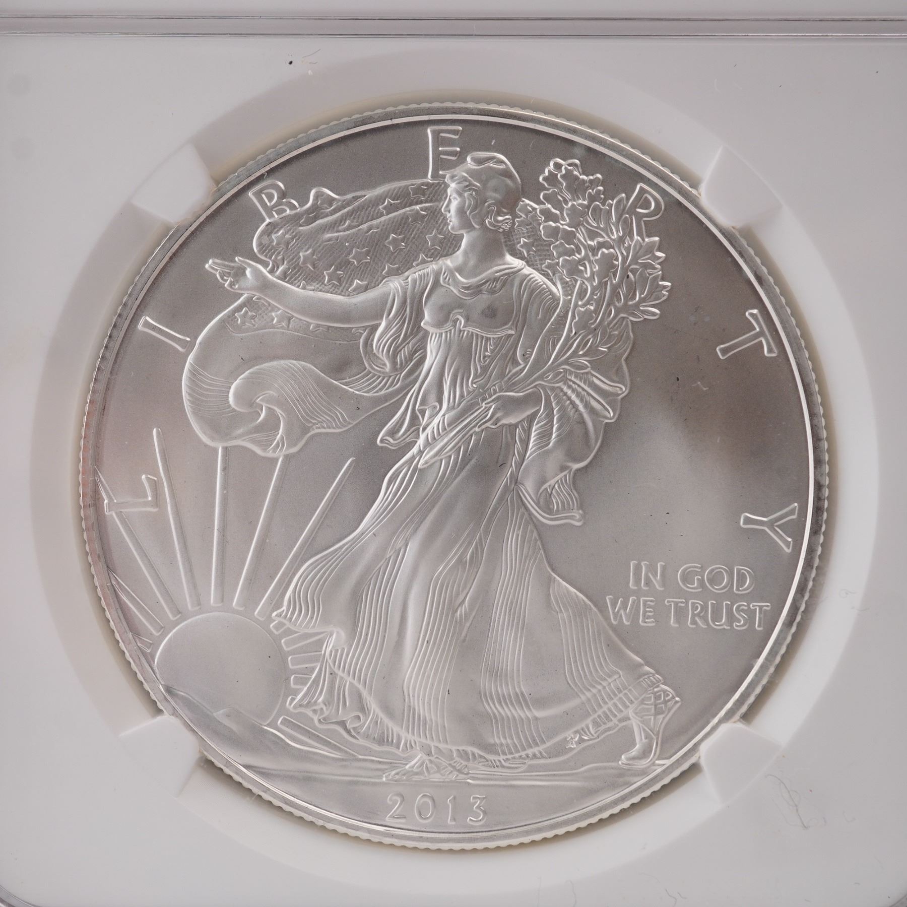 One United States Mint American Silver Eagle one-dollar coin, struck at the San Francisco Mint in 2013. This example is an Early Releases issue graded Mint State 70 (MS 70) by the Numismatic Guaranty Corporation (NGC). The obverse features the classic Walking Liberty design created by Adolph A. Weinman, originally used on the half dollar from 1916 to 1947. The full-length figure of Liberty strides toward the sun, enveloped in the folds of the American flag, with her right hand extended and a branch of laurel and oak cradled in her left arm. The design includes the inscriptions LIBERTY, IN GOD WE TRUST, and the year 2013. The reverse, designed by John Mercanti, depicts a heraldic eagle behind a shield, clutching an olive branch in the right talon and arrows in the left. Thirteen stars representing the original colonies are positioned above the eagle. Inscriptions include UNITED STATES OF AMERICA, 1 OZ. FINE SILVER-ONE DOLLAR, and E PLURIBUS UNUM. This is the Type 1 reverse design, used from 1986 through mid-2021. Composed of one troy ounce of .999 fine silver, this coin is encased in a secure, tamper-evident NGC holder. The label indicates its strike origin at the San Francisco Mint and designates it as an Early Release. Slab: 2.25"L x 0.5"W x 3.25"H. Coin diameter: 39mm.