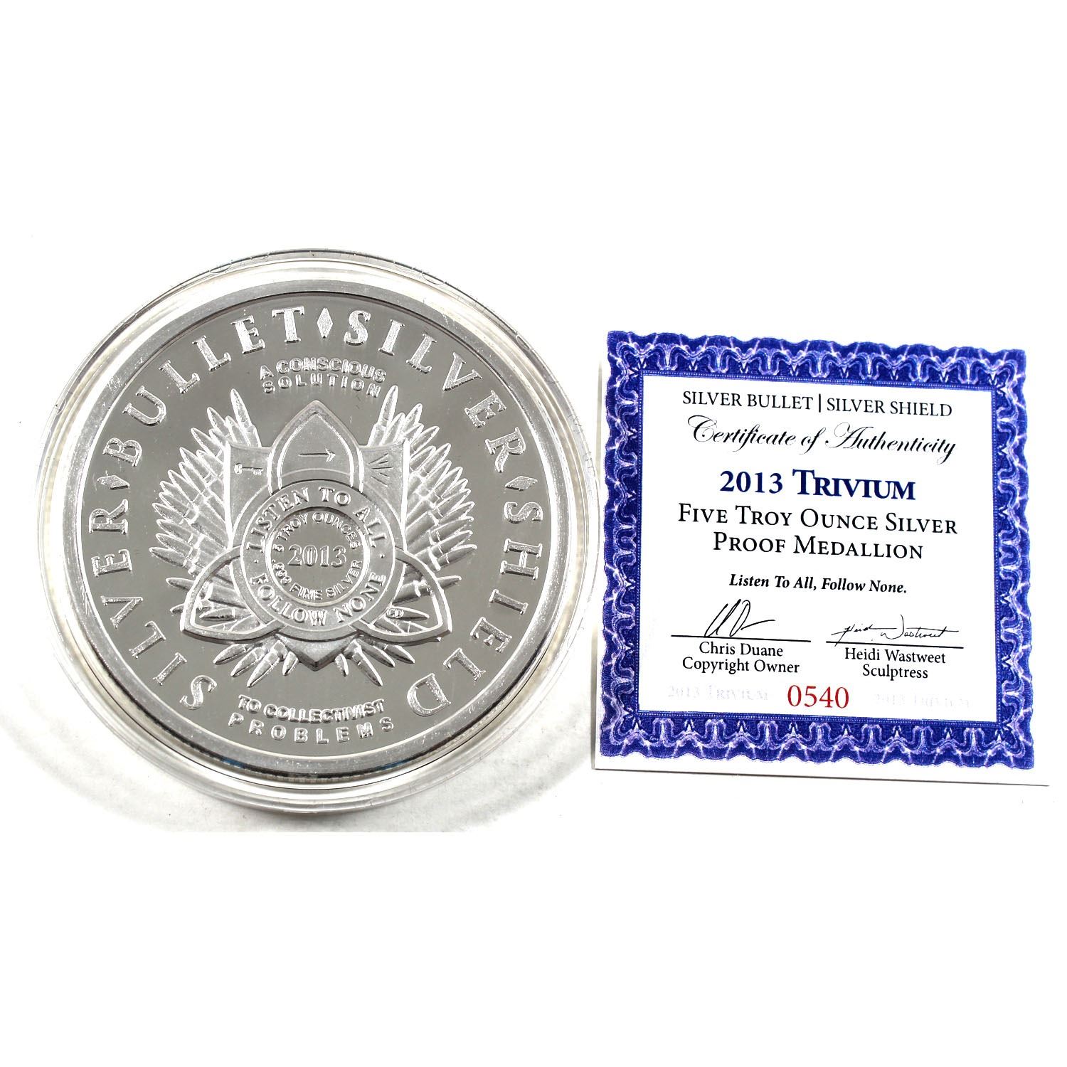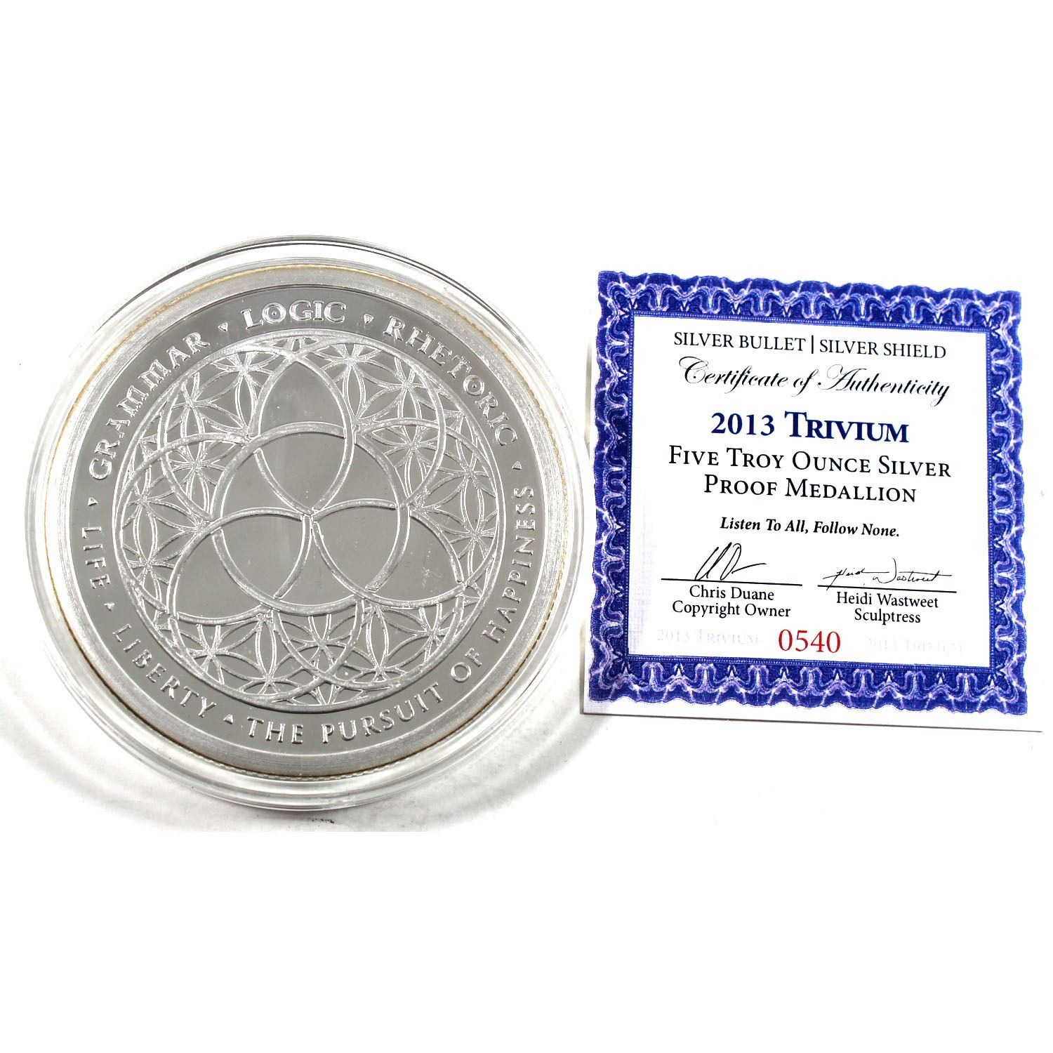 2013 Silver Bullet Silver Shield 5oz Trivium 'Grammar, Logic, Rhetoric' .999 Fine Silver Proof Medallion Encapsulated in Black Display Box with COA #0540 (TAX Exempt).