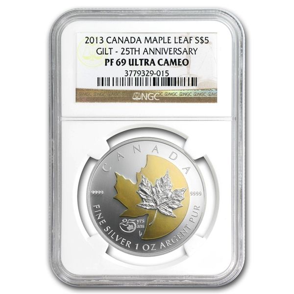 2013 Silver Can. 25th Anniv. of the Maple -Gilded PF-69 **|**|** 2013 Silver Can. 25th Anniv. of the Maple -Gilded PF-69 UCAM NGC ; MSRP: $500
