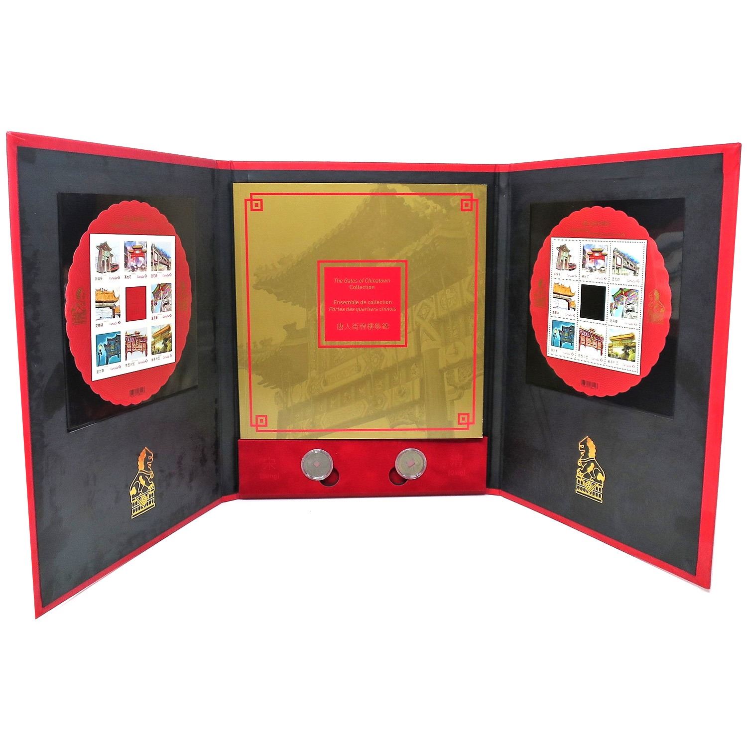 2013 The Gates of Chinatown Coin & Stamp Limited Edition Collector's Set. Only 8888 Sets Produced! INCLUDES: 2x authentic Dynasty coins; a 1,000 year old Song Dynasty coin and 200 year old Qing Dynasty coin, akin to the ancient coins embedded in many of these gates. As well as a 16-page full colour booklet, numbered and imperforated pane of 8 stamps, & regular pane of 8 stamps die cut in the shape of early Chinese coins. (Tax Exempt)