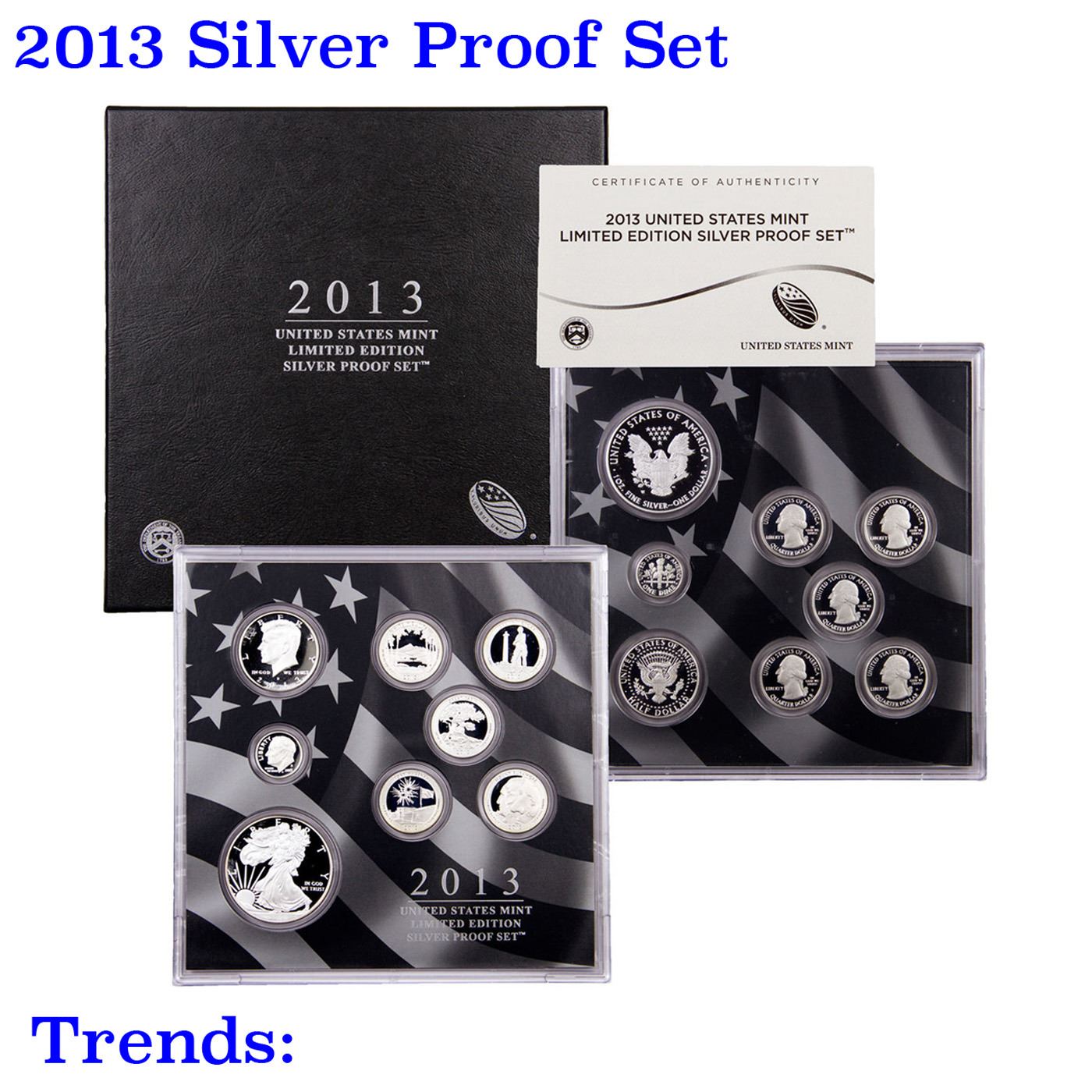 2013 United States Limited Edition Silver Proof Set. 2013 United States Mint Limited Edition Silver Proof Set contains eight silver coins, the 5 2013-S National Parks quarters (White Mountain National Forest, Perry’s Victory and International Peace Memorial, Great Basin National Park, Fort McHenry National Monument and Historic Shrine, Mount Rushmore National Memorial) , as well as a 2013-S Roosevelt dime, 2013-S JFK half dollar and 2013-W Proof Silver Eagle. Limited mintage of only 50,000 sets.