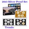 2013 United States Mint Silver Proof Set - 14 pc set, about 1 1/2 ounces of pure silver. The 2013 set contains the copper-plated Lincoln Shield Cent, and Jefferson Nickel, Roosevelt Dime, America the Beautiful Quarters and Kennedy Half Dollar struck in cameo cupro-nickel-and the Presidential and Native American Golden Dollars. That's 14 coins total in the set, all in official U.S. Mint boxes. The cupro-nickel quarters depict: White Mountain National Forest, Perry's Victory Memorial, Great Basin National Park, Fort McHenry, Maryland, and Mount Rushmore. The set contains the William McKinley, Theodore Roosevelt, William Taft and Woodrow Wilson Presidential Dollars, and the new Native American Dollar featuring the 1778 Treaty with the Delawares.