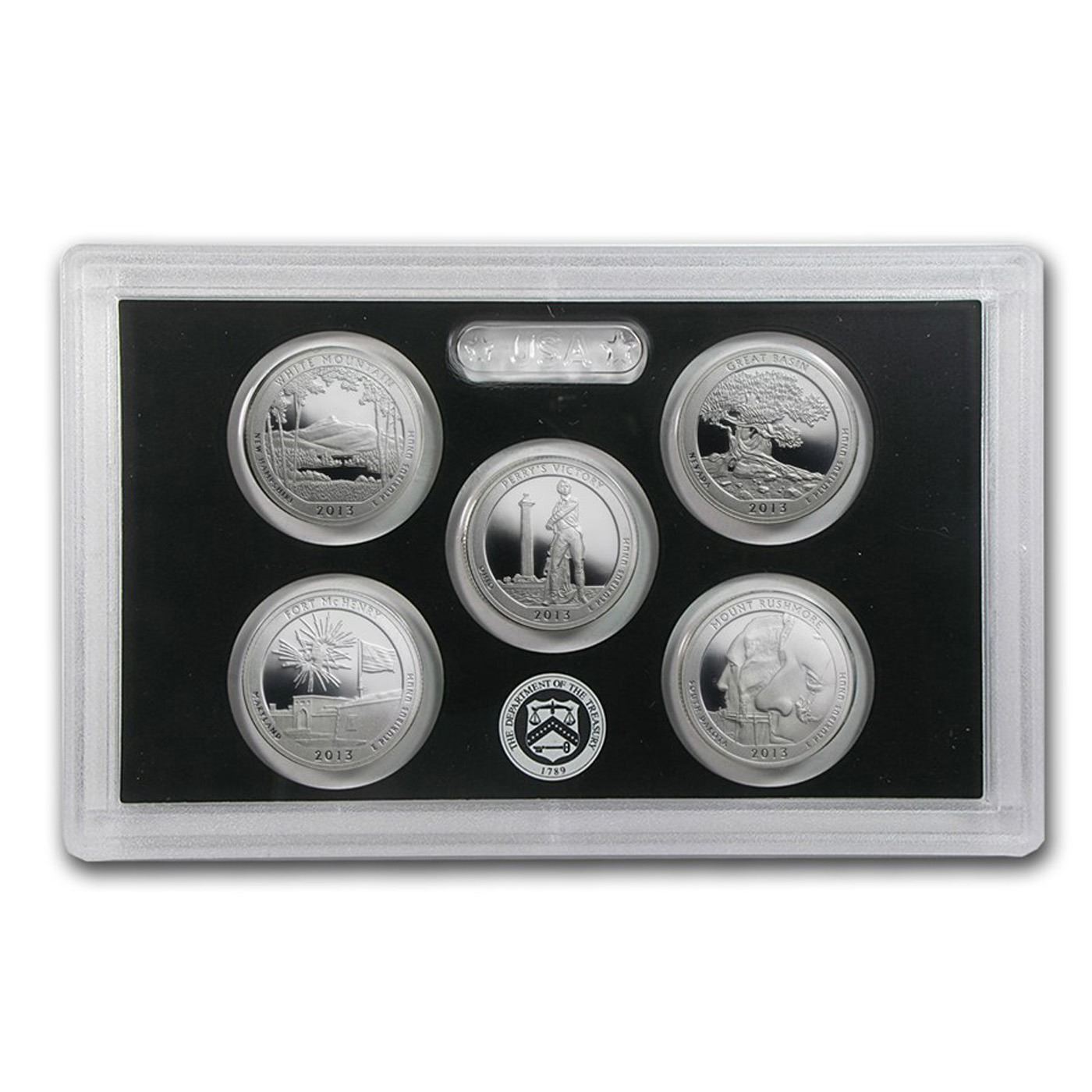2013 United States Mint Silver Proof Set - 14 pc set, about 1 1/2 ounces of pure silver. The 2013 set contains the copper-plated Lincoln Shield Cent, and Jefferson Nickel, Roosevelt Dime, America the Beautiful Quarters and Kennedy Half Dollar struck in cameo cupro-nickel-and the Presidential and Native American Golden Dollars. That's 14 coins total in the set, all in official U.S. Mint boxes. The cupro-nickel quarters depict: White Mountain National Forest, Perry's Victory Memorial, Great Basin National Park, Fort McHenry, Maryland, and Mount Rushmore. The set contains the William McKinley, Theodore Roosevelt, William Taft and Woodrow Wilson Presidential Dollars, and the new Native American Dollar featuring the 1778 Treaty with the Delawares.