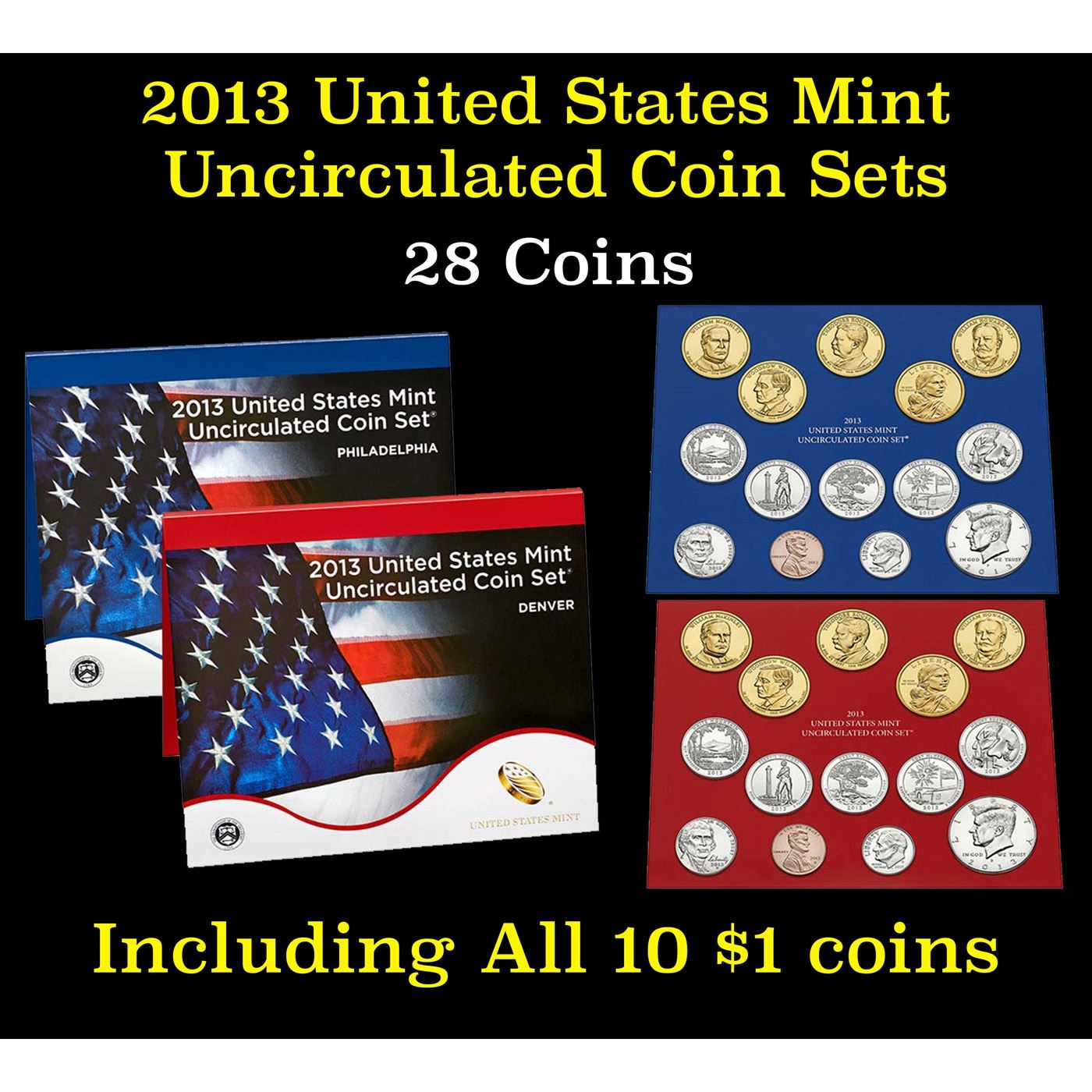 2013 United States Mint Uncirculated Coin Set 28 coins. The 2013-PD Mint Set consisted of two different sets in two blister-style folders. The blue folder contains coins from the Philadelphia Mint, the red folder contains coins from the Denver Mint. Each folder contains the Cents, Nickels, Dime, Half Dollar, and Dollar, alongside the following five 2013 Quarters: White Mountain National Forest, Perry's Victory and International Peace Memorial, Great Basin National Park, Fort McHenry National Monument, and Mount Rushmore National Memorial. Completing each folder are the four 2013 Presidential Dollars: William McKinley, Theodore Roosevelt, William Howard Taft, and Woodrow Wilson.
