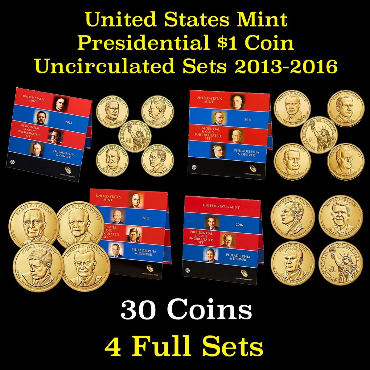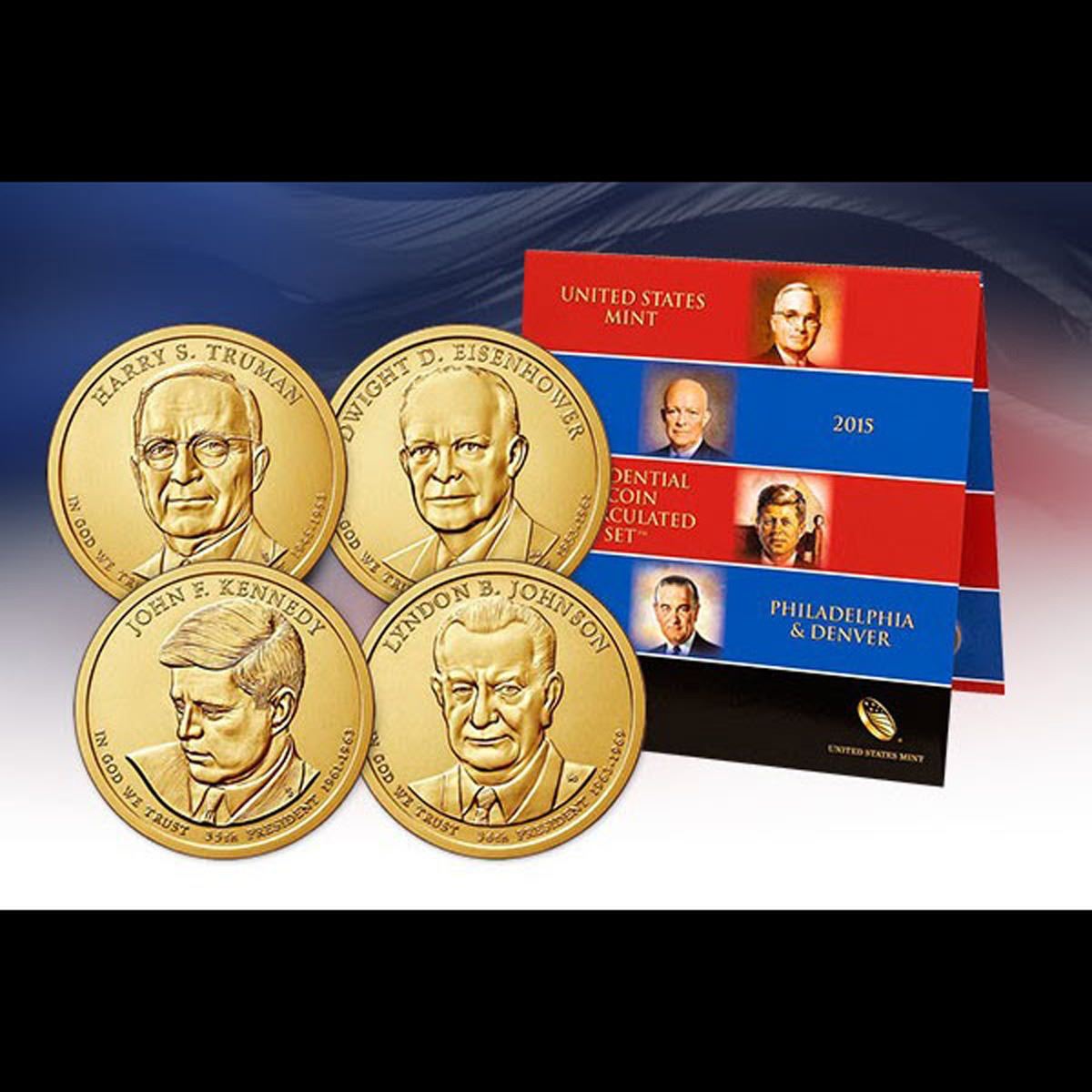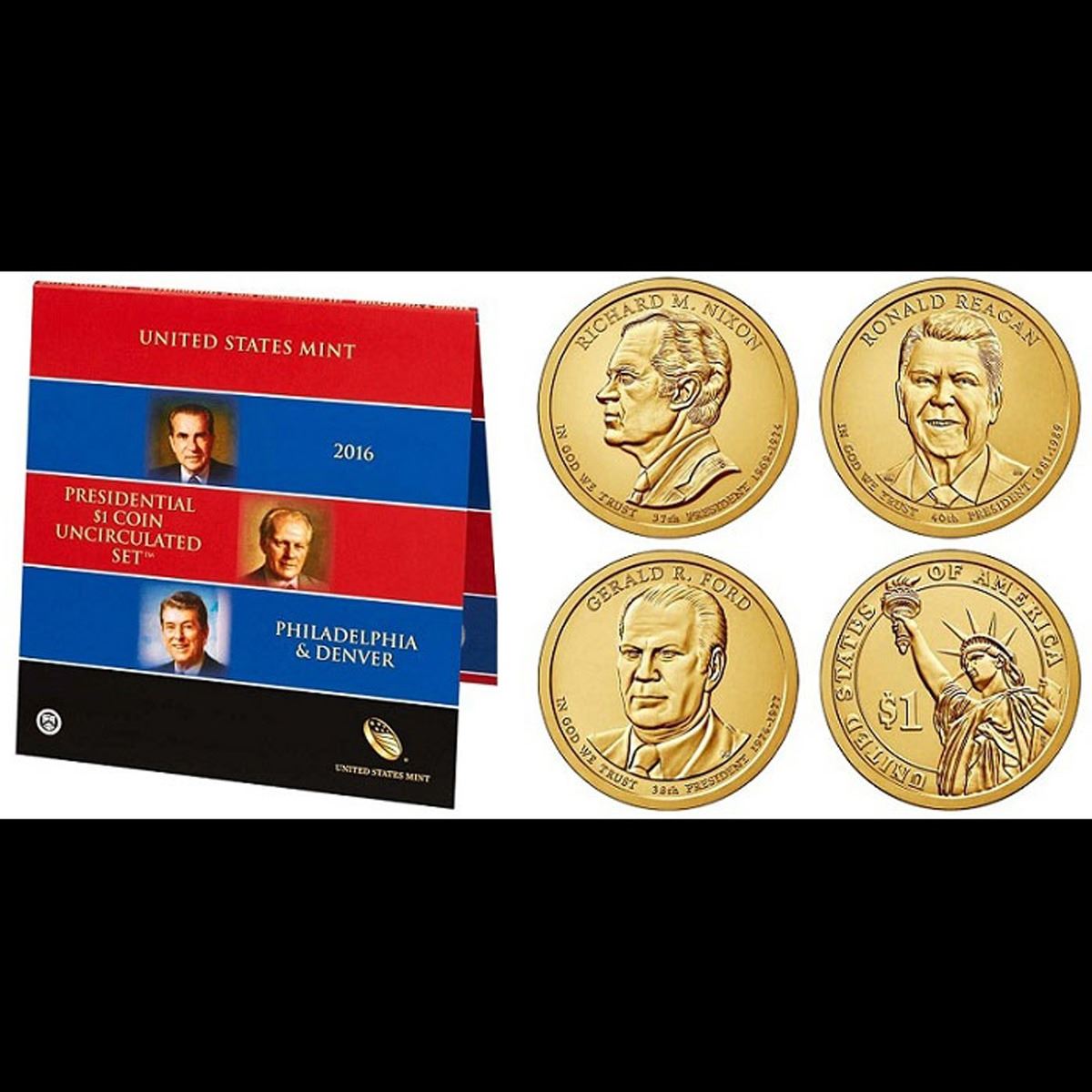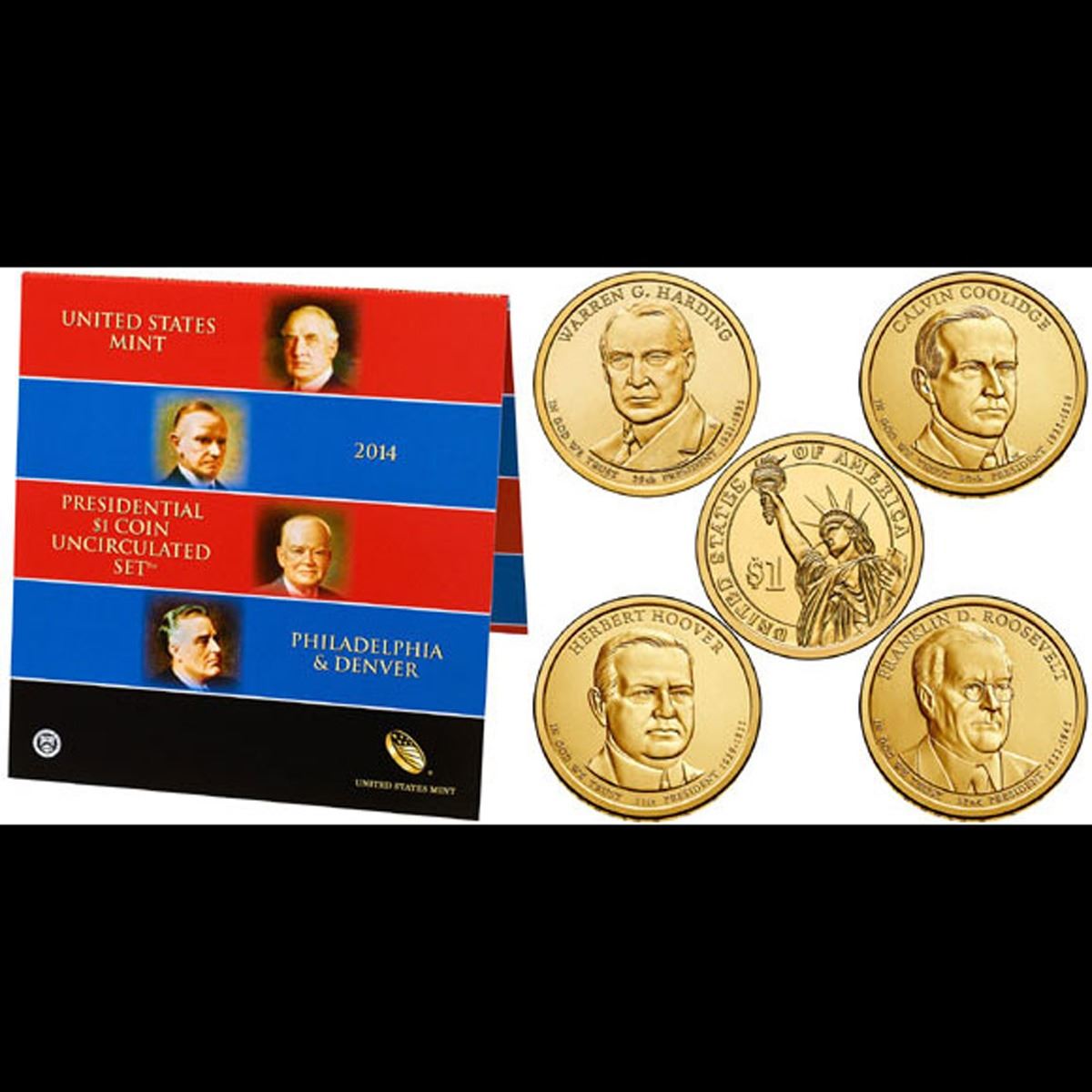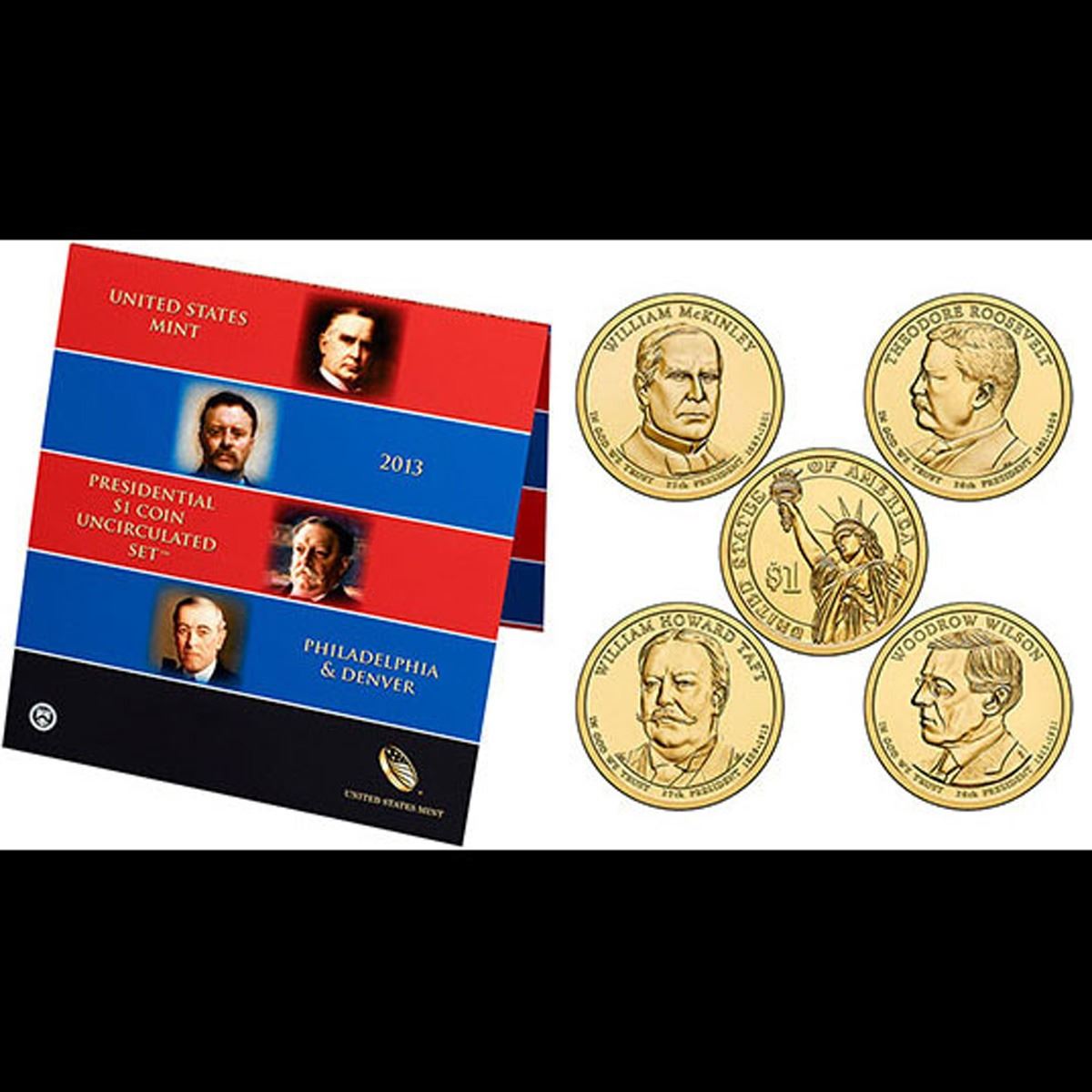 2013 United States Presidential $1 Mint Set Grades. The 2013 United States Mint Presidential $1 Coin Uncirculated Set contains eight coins–four each from the United States Mint facilities at Philadelphia (“P” mint mark) and Denver (“D” mint mark). The reverse (tails side) of each coin features a striking rendition of the iconic Statue of Liberty, common to all Presidential $1 Coins. The coins are encased in a protective, rotatable blister, allowing full visibility of the edge–incused inscriptions E PLURIBUS UNUM, 2013, and the mint mark. The inscription IN GOD WE TRUST is displayed on the obverse. The coins are mounted in an attractive folder that includes brief biographical sketches and portraits of each President.