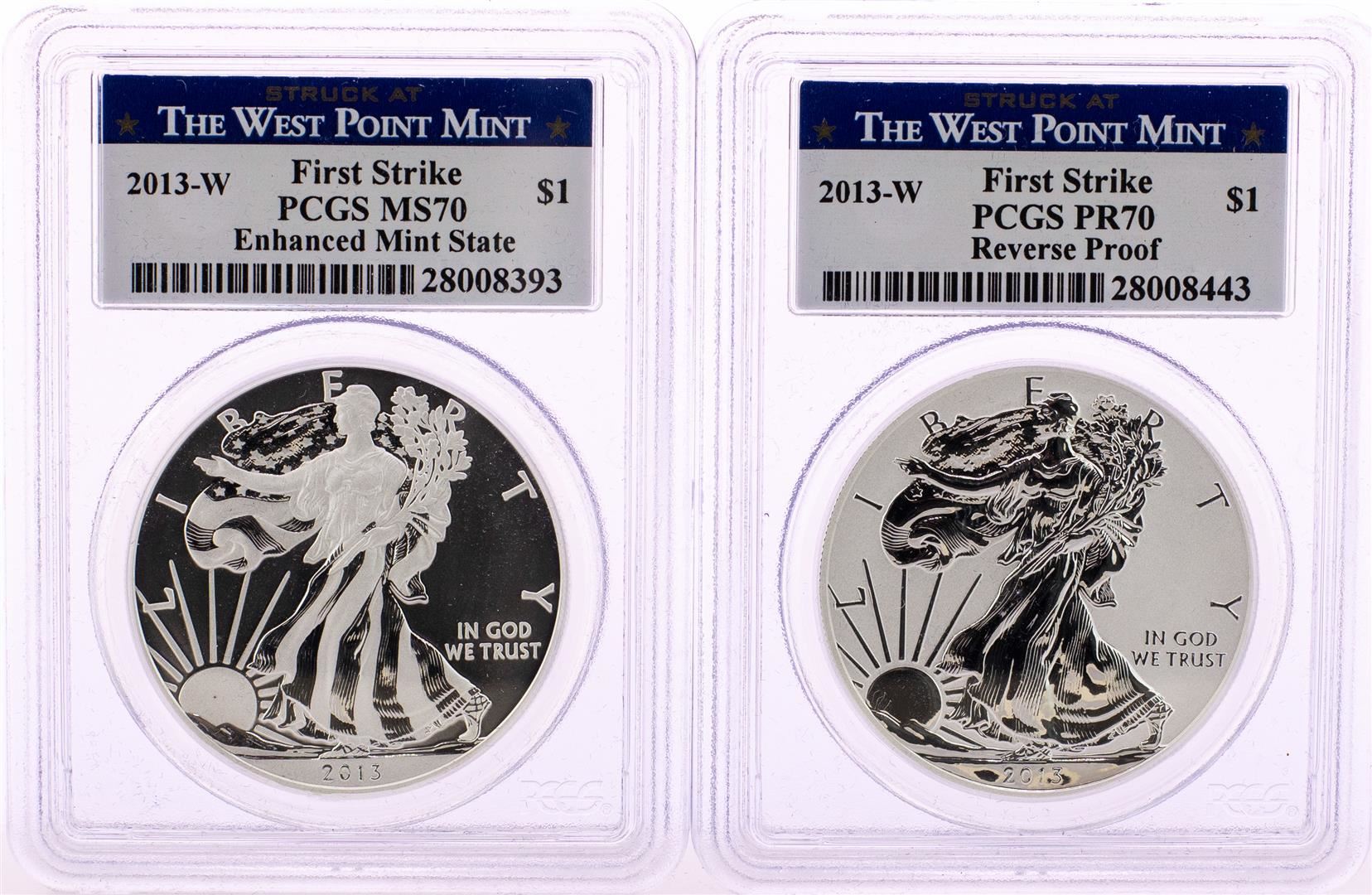 One 2013-W $1 American Eagle West Point Two-Coin Silver Set PCGS MS70/PR70 First Strike. PCGS Graded.