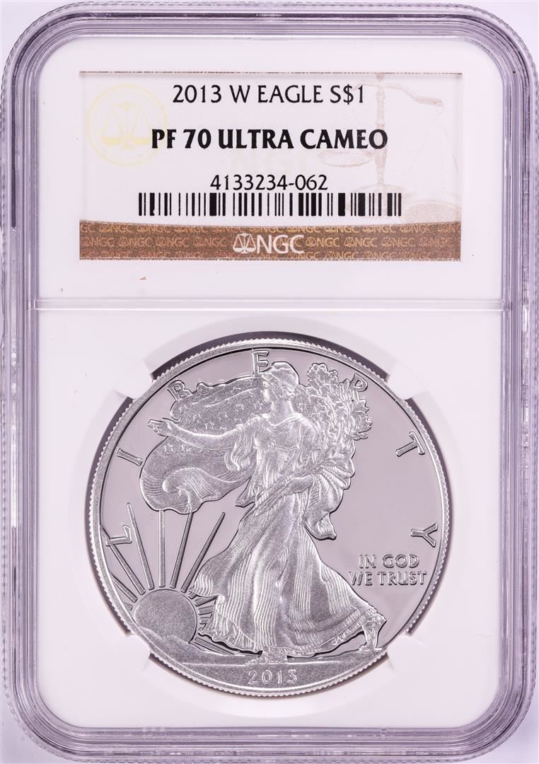 One 2013-W $1 Proof American Silver Eagle Coin NGC PF70 Ultra Cameo. NGC Certified.