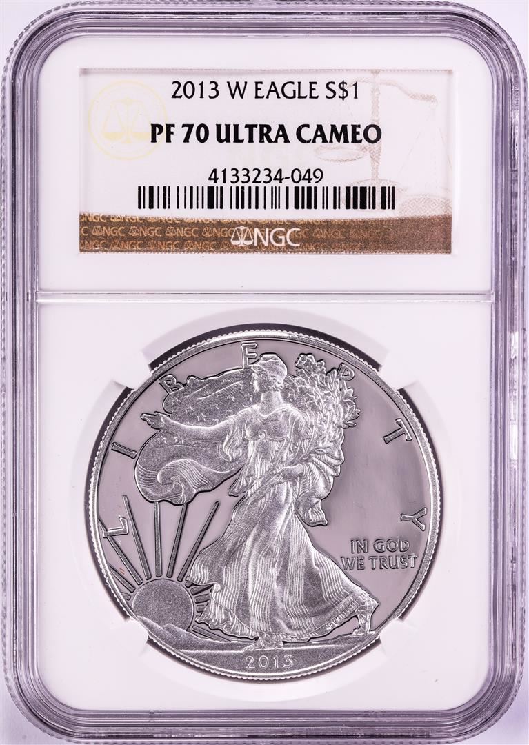 One 2013-W $1 Proof American Silver Eagle Coin NGC PF70 Ultra Cameo. NGC Certified.