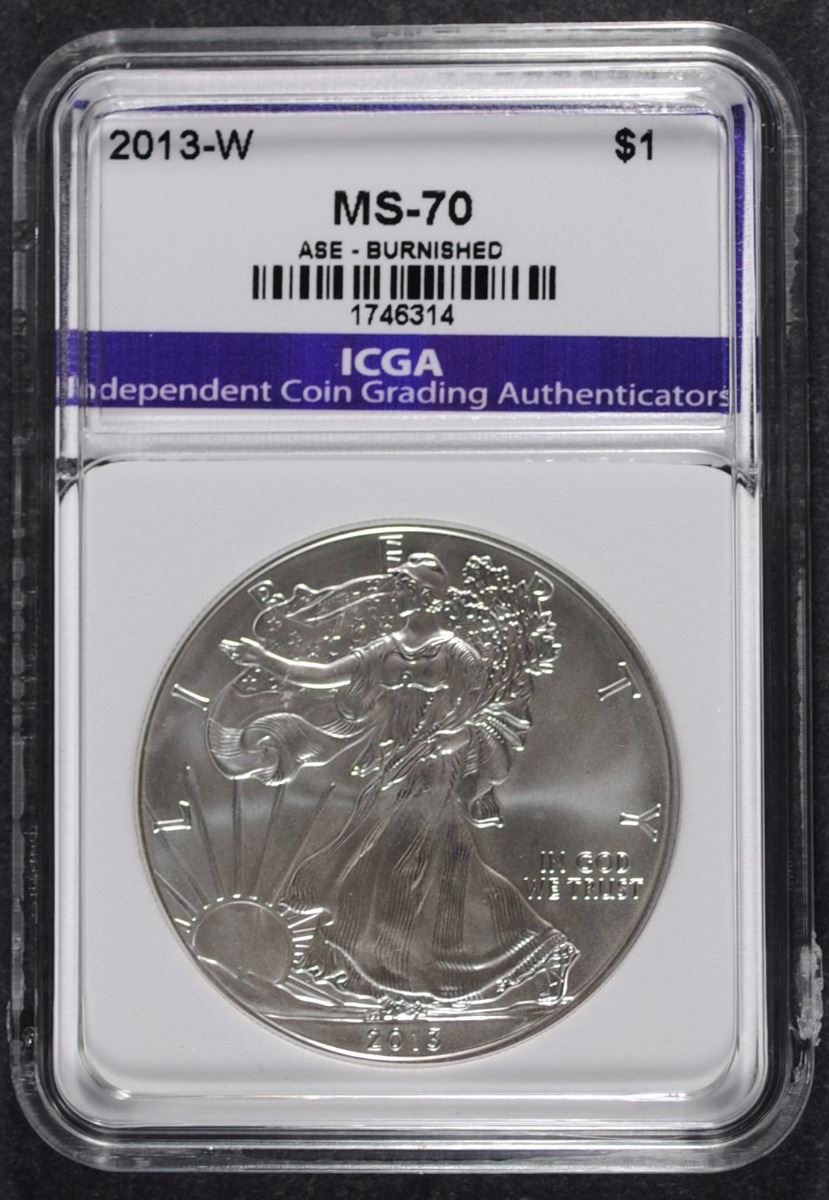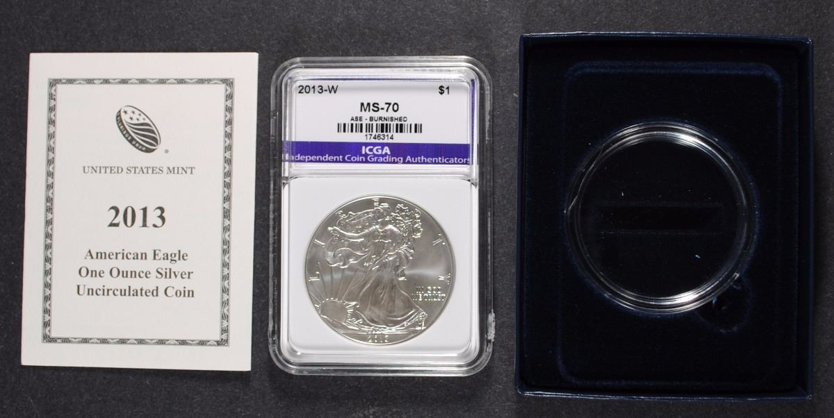 2013-W BURNISHED AMERICAN SILVER EAGLE ICGA PERFECT GEM BU, WITH ORIG BOX/COA