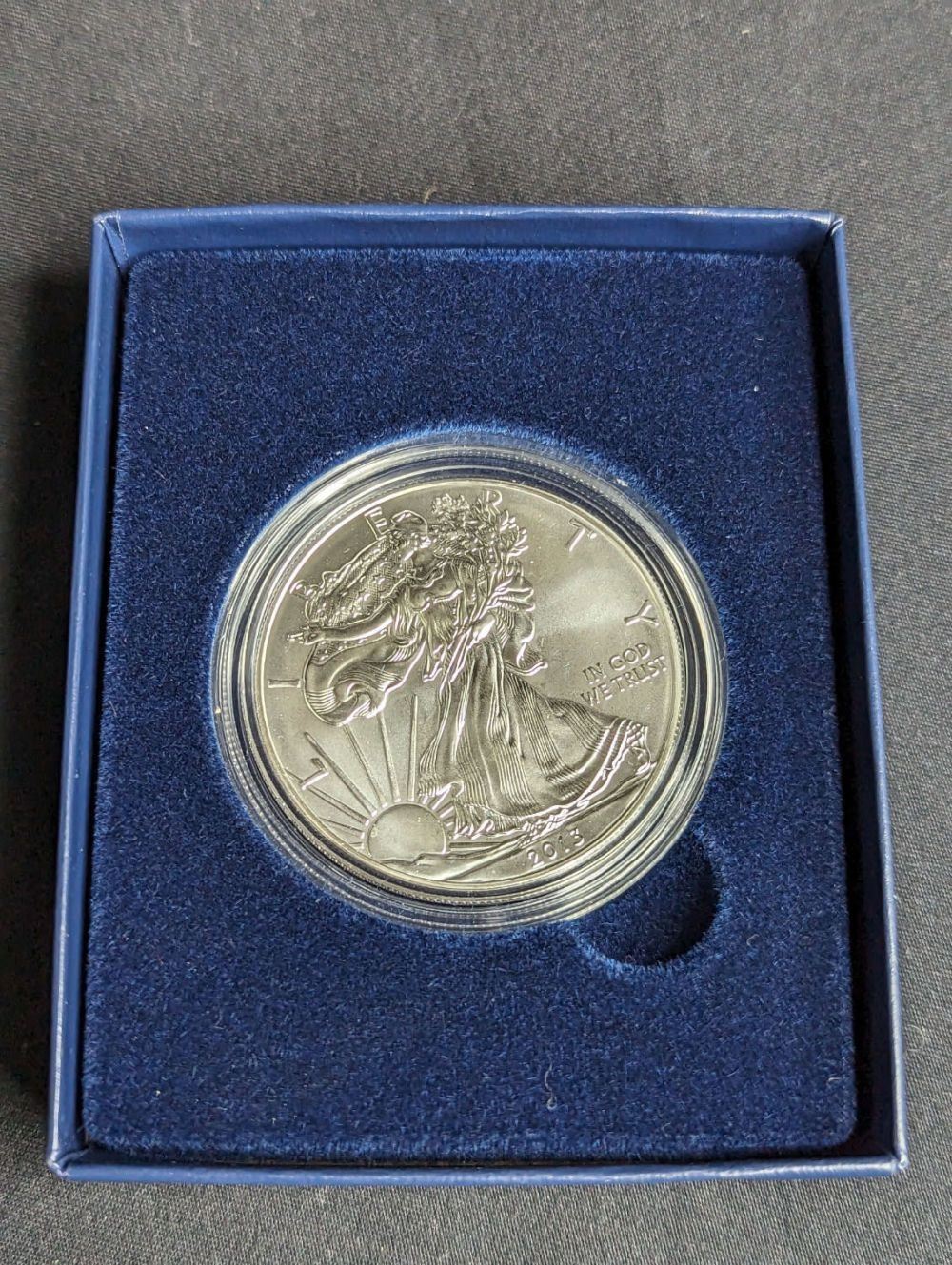 A 2013 West Point Issue Burnished American Silver Eagle, in government issue Box with COA.& nbsp; A snow white uncirculated example of the Silver Eagle Series